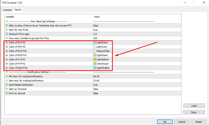 Bonjour ! Vous pouvez modifier la couleur en appuyant sur la couleur par défaut de chaque variable FVG dans l'onglet d'entrée (paramètres) de l'EA