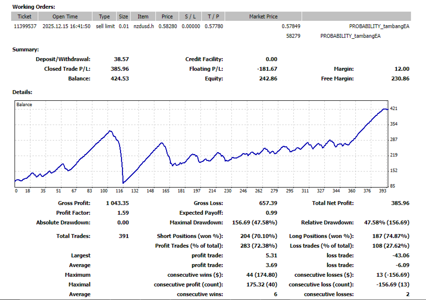 "Probability" è un innovativo Expert Advisor che armonizza i rigori della teoria della probabilità con una strategia di media pragmatica, garantendo ai trader di ottenere risultati coerenti senza esporsi a rischi inutili. La sua capacità di trading multicoppia, combinata con un solido framework di gestione del rischio, lo rende una scelta ideale per i trader che cercano di massimizzare il loro potenziale mantenendo il controllo sui loro investimenti. Che tu sia un principiante o un professionista esperto, "Probability" offre una soluzione affidabile ed efficiente per orientarti nelle complessità del mercato Forex.