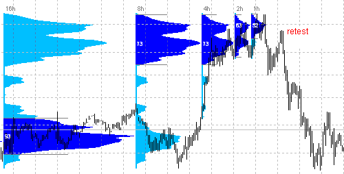 Есть маленький нюанс – поскольку на момент наступления ретеста, а это произойдет через какое-то количество свечей, профили уже расползутся, и будет видна совершенно другая картинка, необходимо заблаговременно зафиксировать при помощи горизонтальной линии, положение вышеупомянутой линии VAL. Либо просто чуток прокрутить график обратно в историю, и профили выстроятся такими, какими были на момент появления сигнала на продажу.