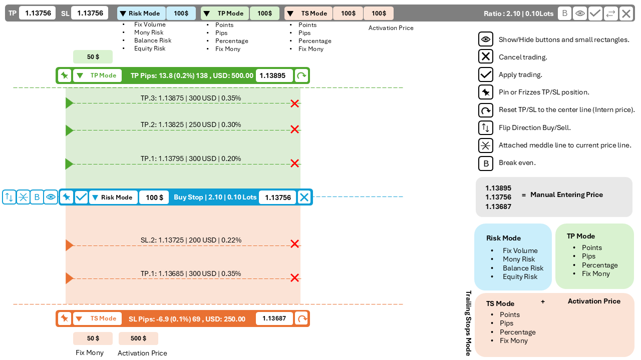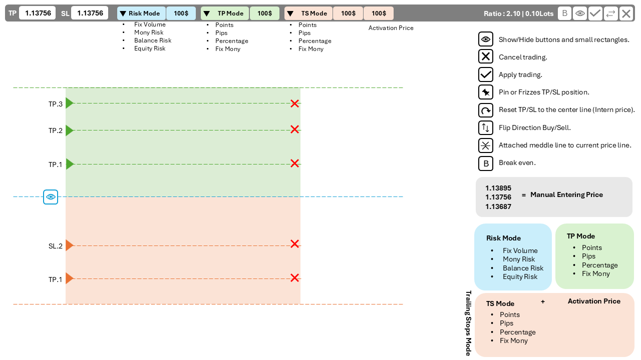 Hi again, 1.The pin icon on the entry block switch to market mode but the entry line grey one did not follow the bid/ask price on tick. 2. The lot size is still fixed when switch to Money Lot/Account Lot Mode under Market mode(Pin icon). Lot size should adjust every tick under market mode(Pin icon) if using Money Lot/ Account Lot Mode. Thanks again!