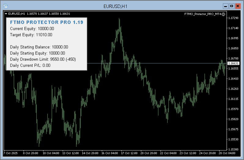 - Visual Information: Displays real-time account metrics, including current equity, target equity, daily starting balance, daily starting equity, daily profit target and daily profit/loss, directly on the chart.