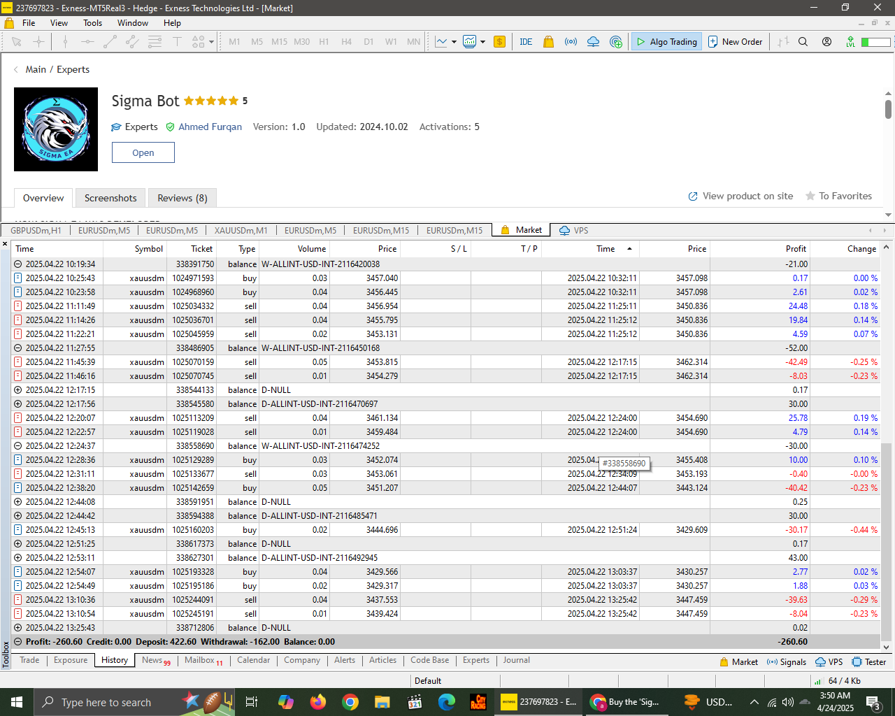 First of all I wanna say that this bot really sucks and it does not work at all cause I purchased it and it lost me around 300+ plus dollars in 3 days, what an achievement, WOW, Please do not buy this bot I am also putting screenshots as a proof that I am not lying, and to the creator of this bot I say please give me the money which I lost with your bot I paid 52 for your bot and then 300 dollars with you bot again shame on you what a shitty robot, NEVER BUY THESE TYPE OF BOTS AGAIN, I also backtested it and had 5000 dollars in my account and GUESS WHAT it ALSO BLEW THAT ACCOUNT TOO, so to sum it up please give me my money again if you have a little pity in yourself, you theif you stole my money now I have financial issues and can't do anything other than crying that why did I buy this shitty bot.