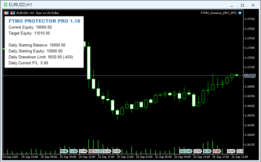 - Visual Information: Displays real-time account metrics, including current equity, target equity, daily starting balance, daily starting equity, daily profit target and daily profit/loss, directly on the chart.
