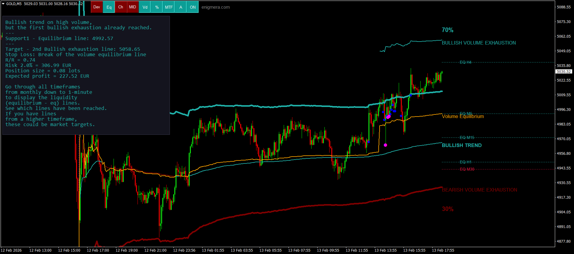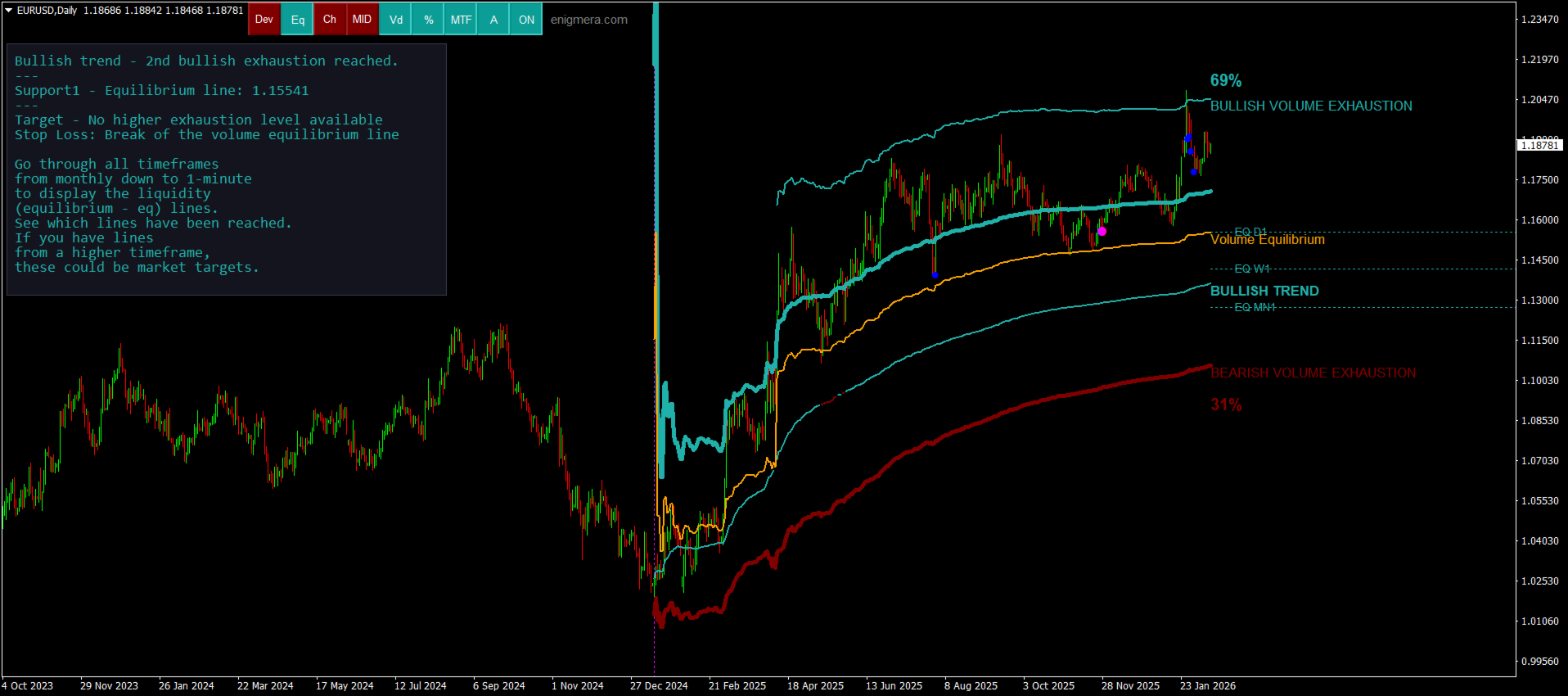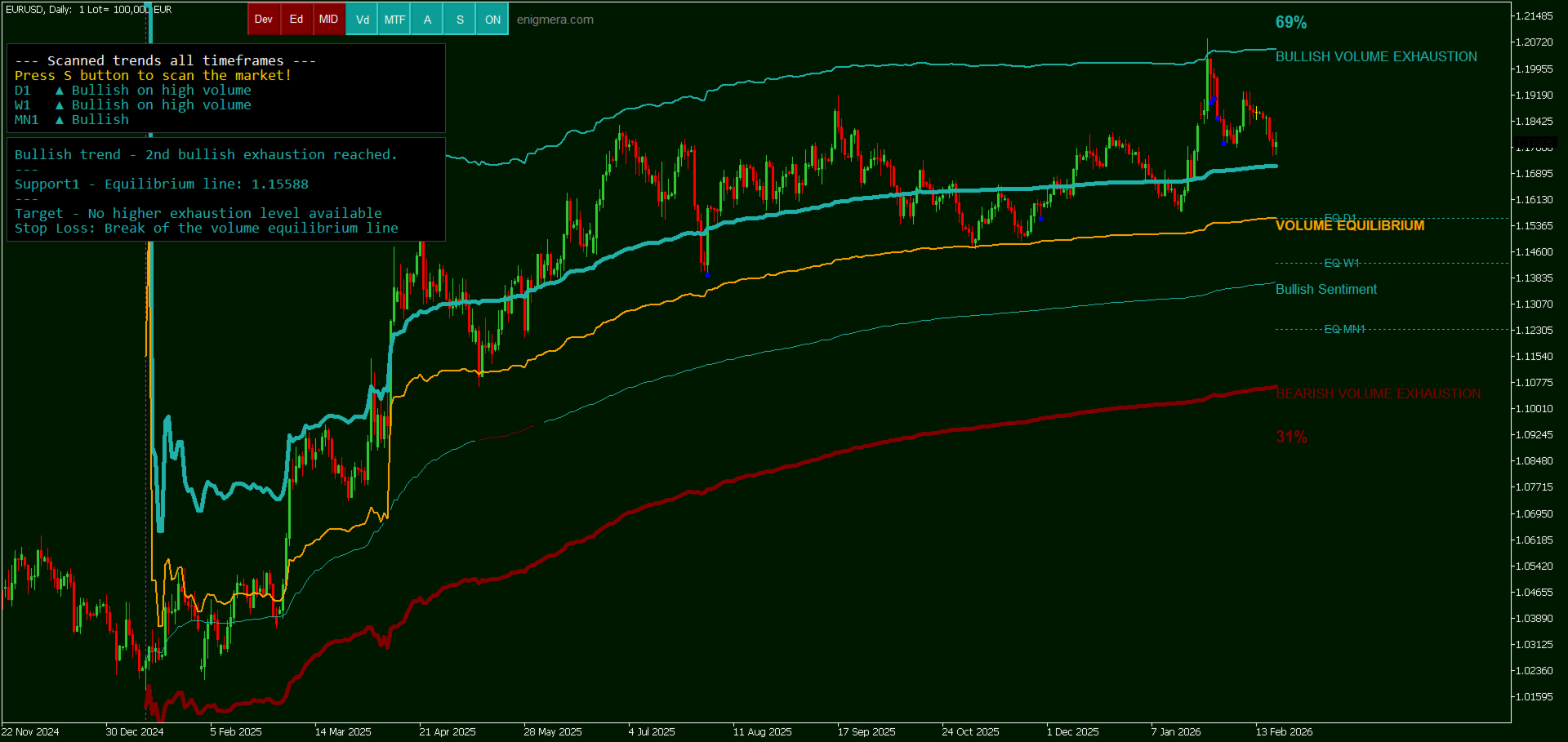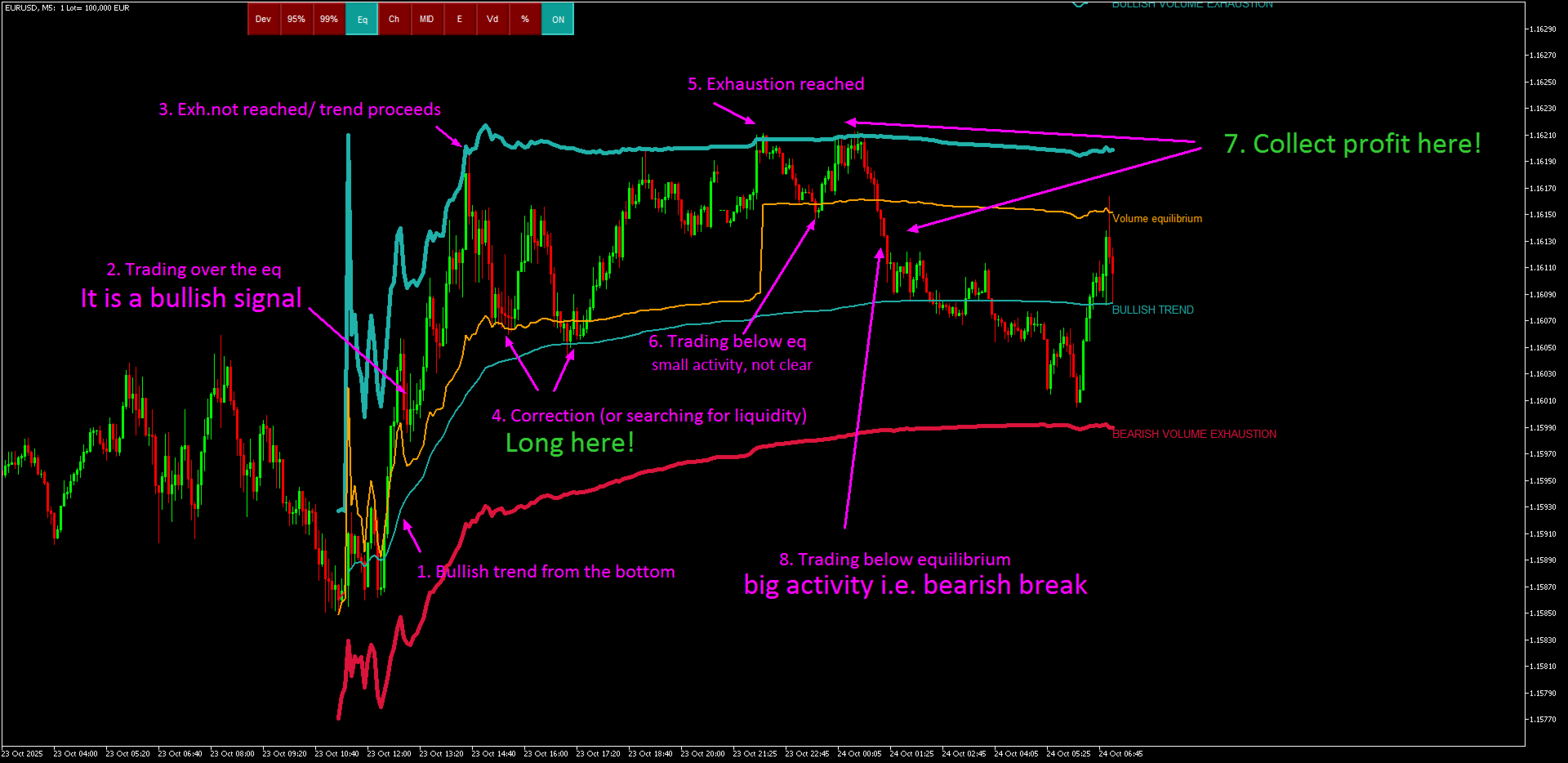 Linea di Equilibrio dei Volumi (Eq). La linea Eq (Volume Equilibrium) è il cuore del sistema. Rappresenta il punto di equilibrio dei volumi tra compratori e venditori. È la liquidità del mercato. Una rottura al di sopra di Eq segnala un bias rialzista, una rottura al di sotto di Eq segnala un bias ribassista. Dopo la rottura, attendere una correzione — quando il prezzo torna verso una delle deviazioni o linee di esaurimento del trend opposto.