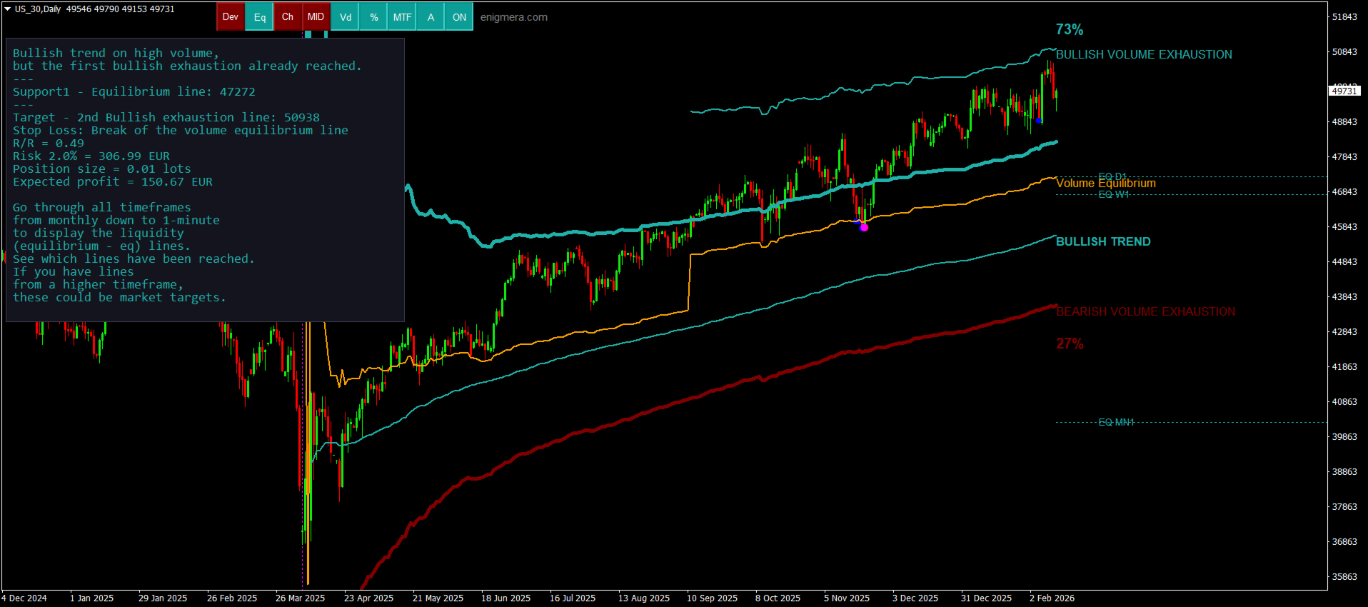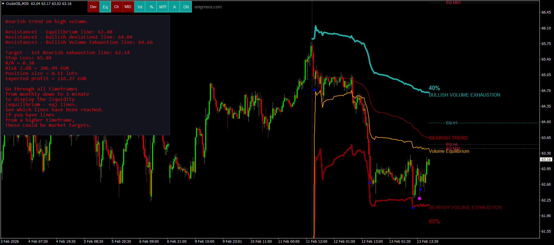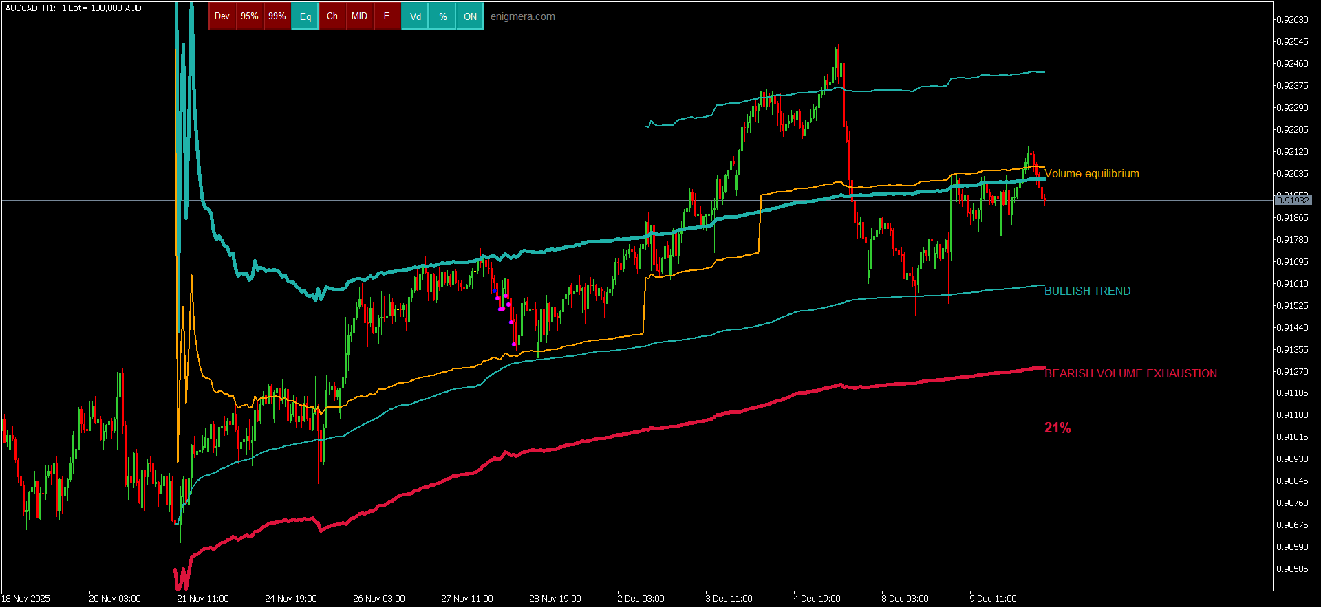 Linea di Equilibrio dei Volumi (Eq). La linea Eq (Volume Equilibrium) è il cuore del sistema. Rappresenta il punto di equilibrio dei volumi tra compratori e venditori. È la liquidità del mercato. Una rottura al di sopra di Eq segnala un bias rialzista, una rottura al di sotto di Eq segnala un bias ribassista. Dopo la rottura, attendere una correzione — quando il prezzo torna verso una delle deviazioni o linee di esaurimento del trend opposto.