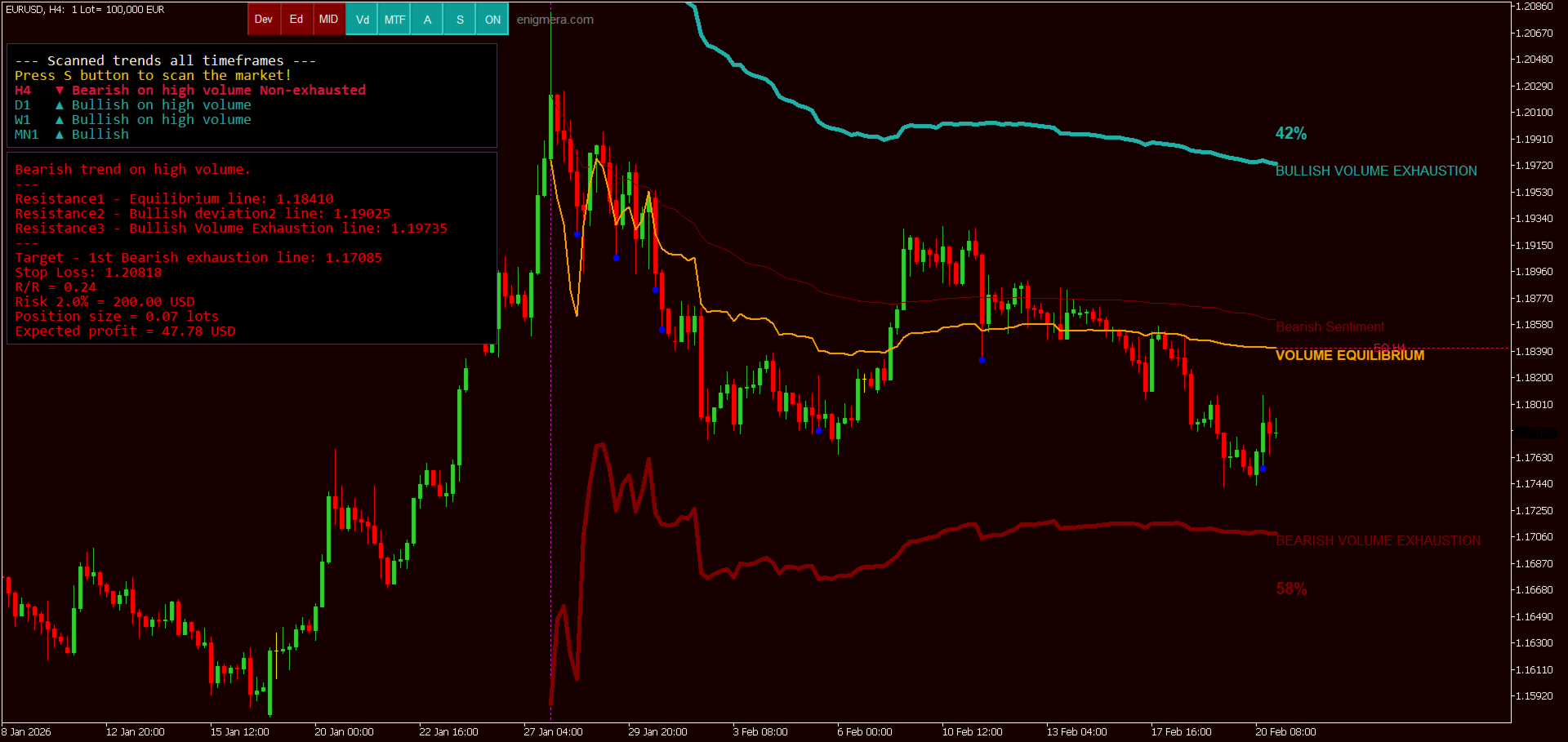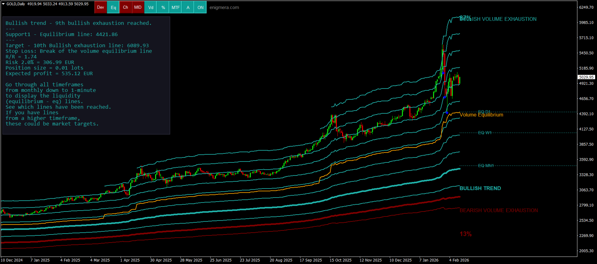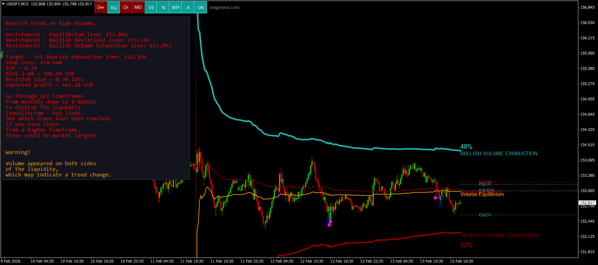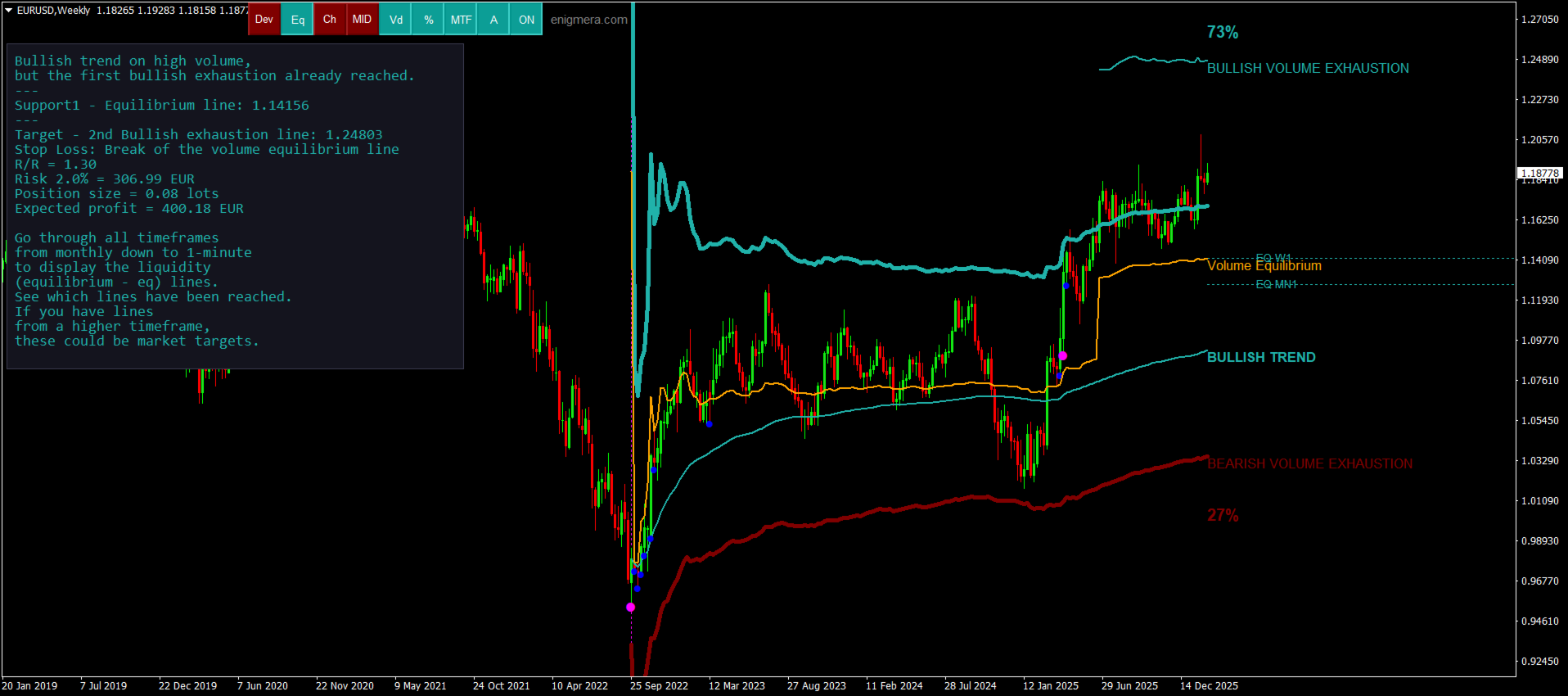 Linea di Equilibrio dei Volumi (Eq). La linea Eq (Volume Equilibrium) è il cuore del sistema. Rappresenta il punto di equilibrio dei volumi tra compratori e venditori. È la liquidità del mercato. Una rottura al di sopra di Eq segnala un bias rialzista, una rottura al di sotto di Eq segnala un bias ribassista. Dopo la rottura, attendere una correzione — quando il prezzo torna verso una delle deviazioni o linee di esaurimento del trend opposto.
