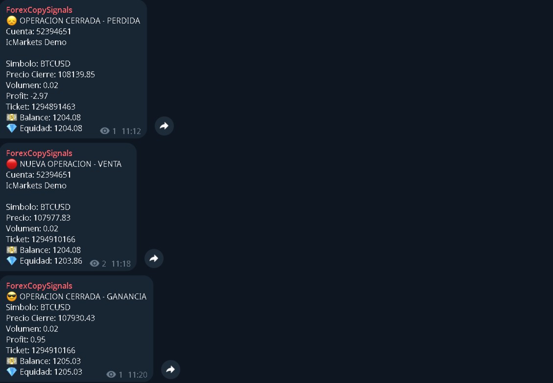 Real-Time Notifications: Receive instant alerts on Telegram for every trade opening and closing. Notifications include key details such as the symbol, trade type (buy or sell), price, volume, and trade outcome, allowing you to stay updated on your trades without needing to be at your trading terminal.