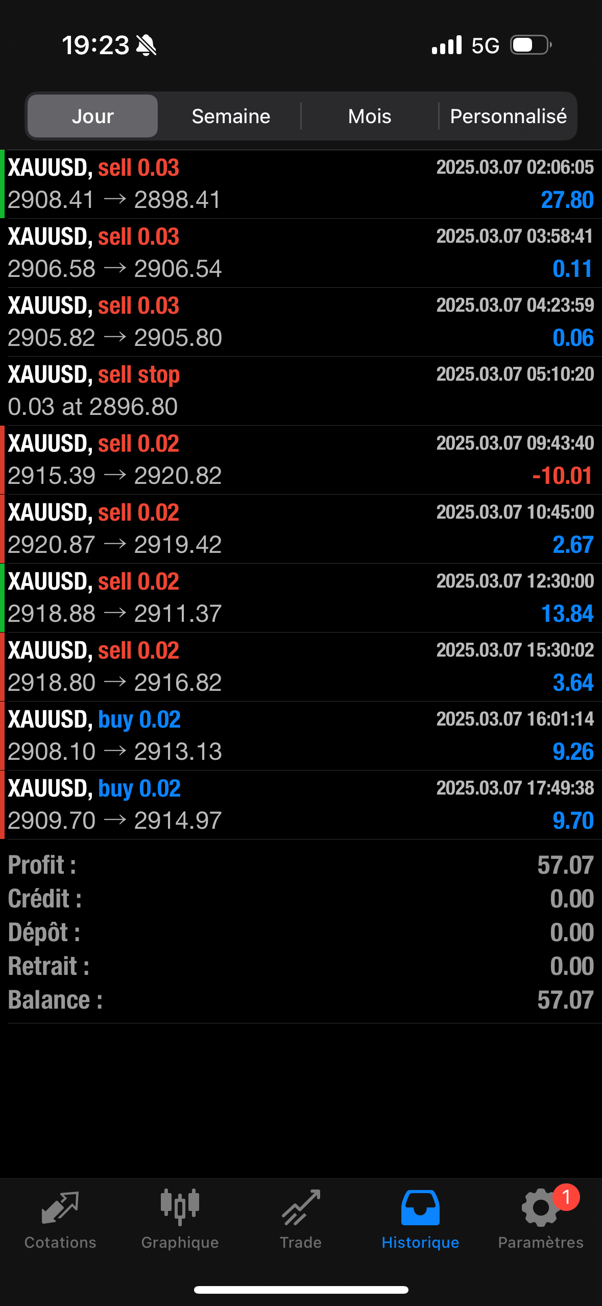 Après des dizaines de backtests avec ces stratégies, j'ai lancé mon vrai compte, et voici le résultat de ce premier jour. (J'ai testé des centaines de robots, et c'est le seul avec lequel j'ai réussi à gagner de l'argent.)