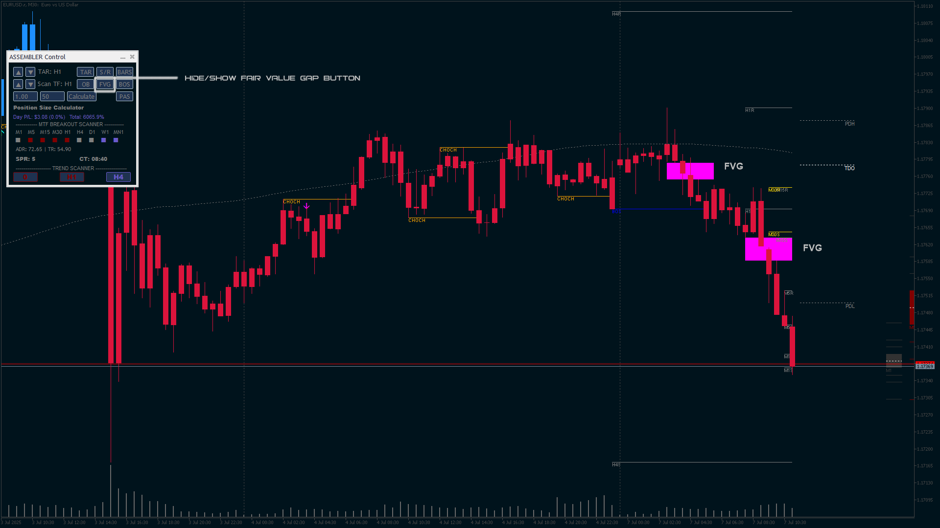 New Feature – Dynamic FVG Detection Across Timeframes Seamlessly detect Fair Value Gaps (FVGs) directly on the current chart. With the integrated control panel's timeframe scroll buttons, traders can now view FVGs from multiple timeframes without switching charts—saving time and enhancing workflow efficiency for ICT and SMC strategies.