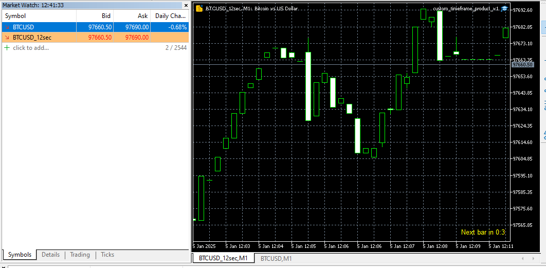 Introducing our Expert Advisor (EA) that empowers you to create custom timeframes in MetaTrader 5, defined in seconds—from as short as 1 second. This EA generates a new symbol with your specified timeframe, updating with every tick. Utilize this symbol for real-time analysis, trading, and backtesting your strategies.