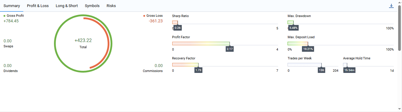 1、每个月执行了强制的止盈止损的策略,每月最多亏损30%,盈利情况根据切入时间点有关系,所以建议在首次测试或者实战交易的时候,在趋势明显的时候再进入。