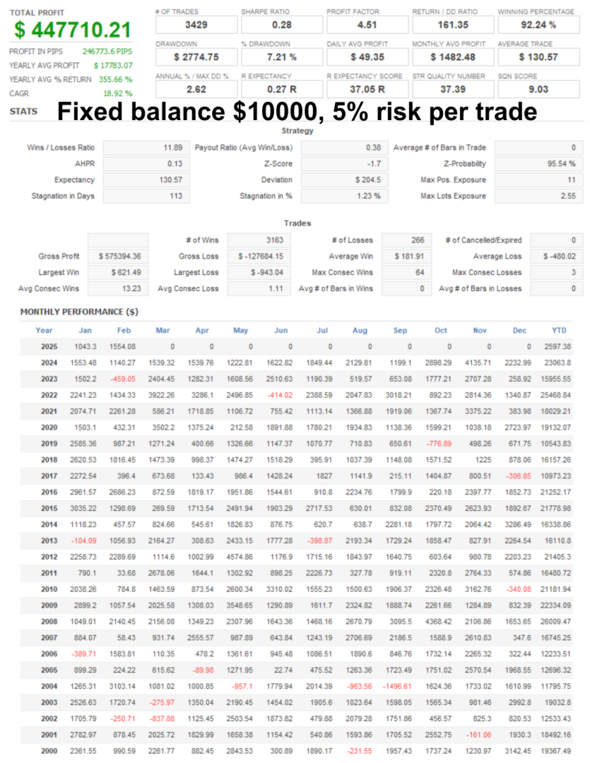 Utilizza un saldo fisso per l'impostazione del rischio automatico -> Utile se vuoi prelevare fondi regolarmente senza dover modificare le impostazioni e semplifica anche il calcolo del profitto medio mensile su periodi più lunghi nel backtest.