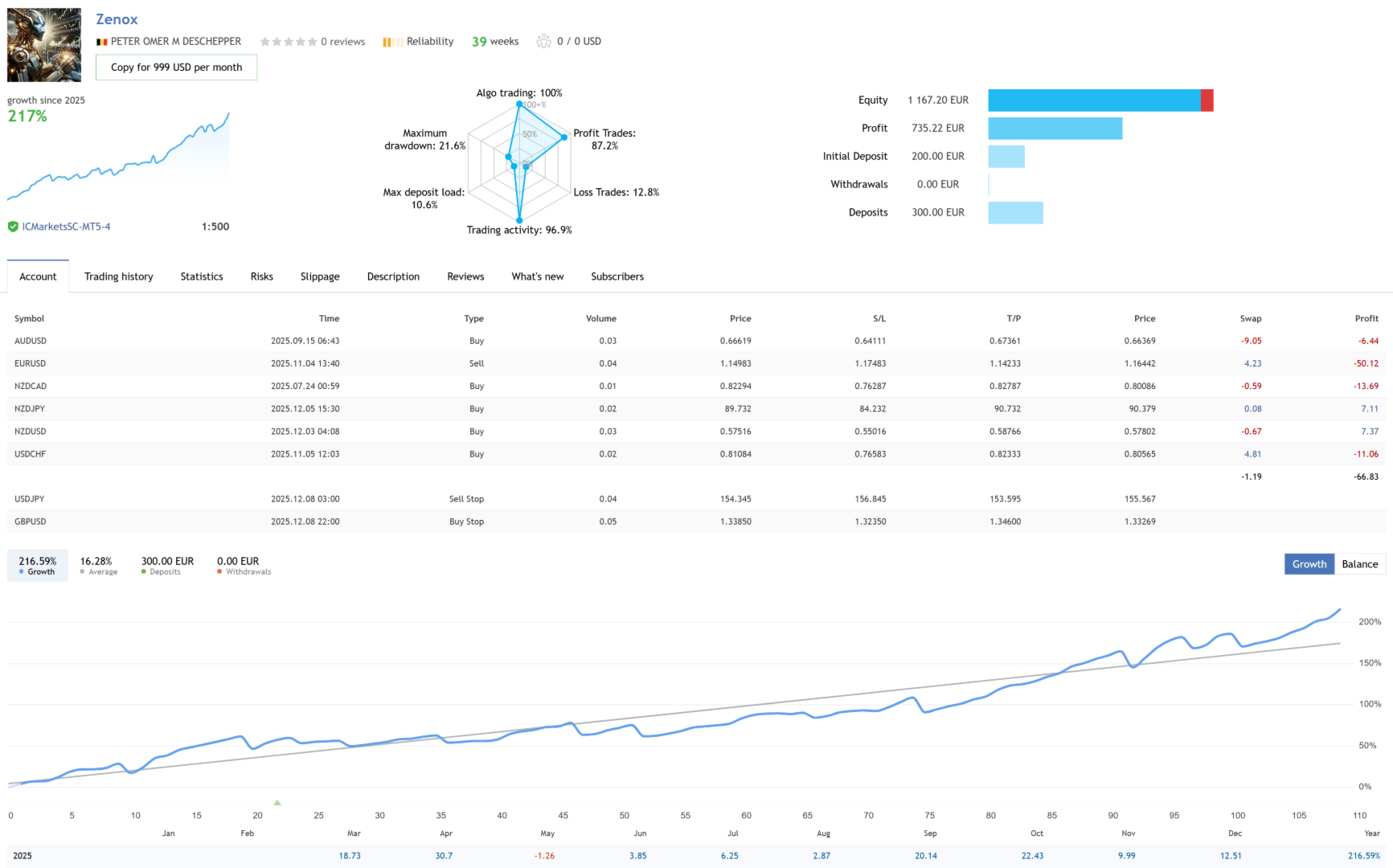 I have to give you a big THANK YOU. I started with 500.00 just to get my mind around the AI thing, and I'll admit I was a little skeptical at first. But then Zenox started doing it magic, they were small moves simply because is only had 500.00 but they were there, so I went ahead and gave it another 500.00 on the 5th Dec 2025 and away it went. From the 5th till 26th 11 days, its up 142.35 with one loss of 33.76, 108.33 overall gain and is actively trading with 1,000.00 base. As of the 1st of Jan 2026 I have given Zenox a total of 4000.00, 27 days later I am now up an additional 444.00 and I keeps right on trading. I officially like AI....LOL....