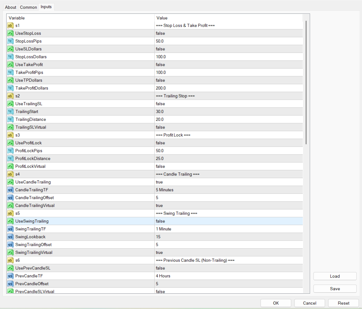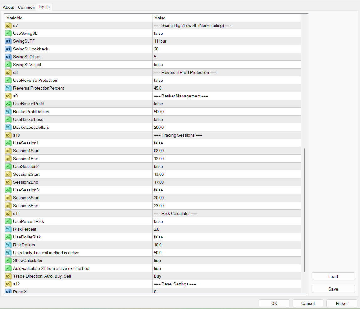 - Swing High/Low SL - non-trailing, set once on recent swing high for sell or recent swing low for buy