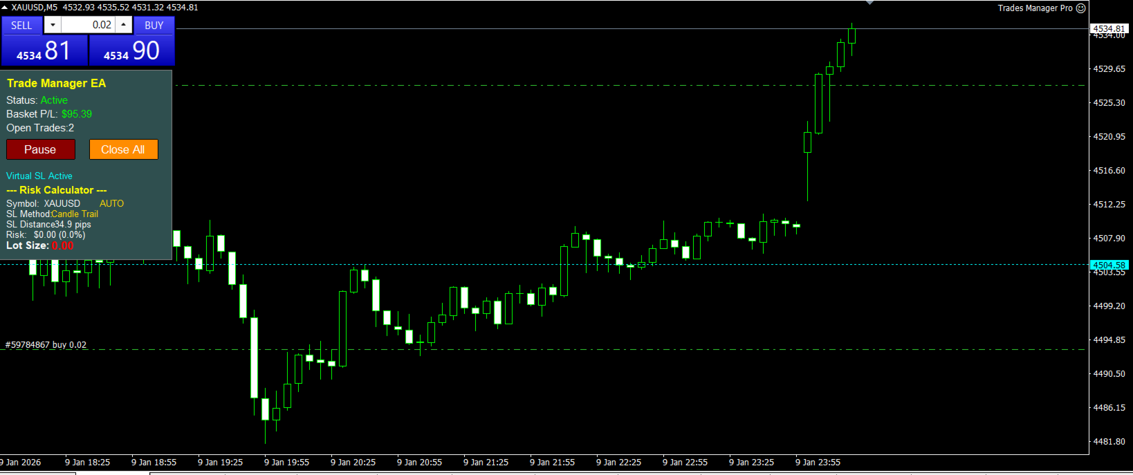 - The EA will automatically manage any active trades on the chart symbol