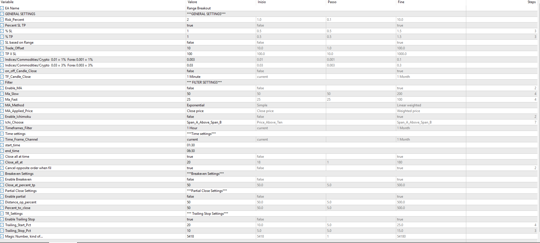 Durata/definizione del range; modalità di ingresso; SL/TP (fisso/percentuale/multipli); trailing/breakeven/partial close; limiti di spread/slippage; filtri opzionali; dimensionamento posizione (rischio % o lotto fisso).