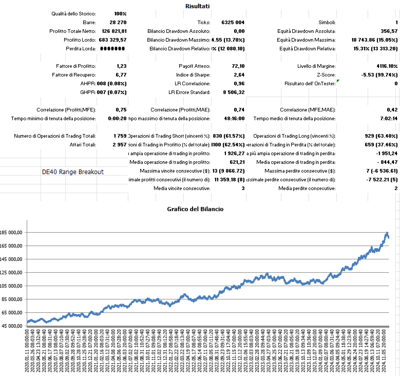 Timeframe operativi tipici: H1 per breakout standard, M5 per impostazioni di tipo scalping. Applicabile a CFD su Forex, Indici, Commodity (verifica parametri per ciascuno strumento).