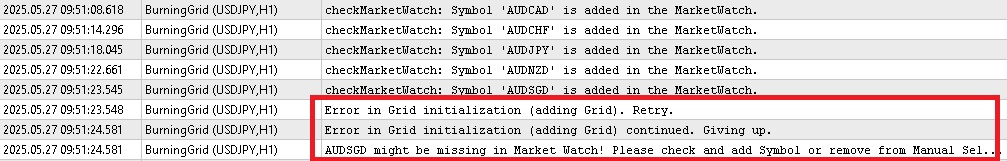 If you select charts by manual selection like in screenshot "manualselection", please take care to add ALL selected pairs to the market watch! See Screenshot "pairs_marketwatch". If missing, BG tries to add them, but depending on the client / cpu power the metatrader client could be too slow and it breaks up. Then you receive the error message shown in "error". Please take care that each activated Pair is listed in Marketwatch!