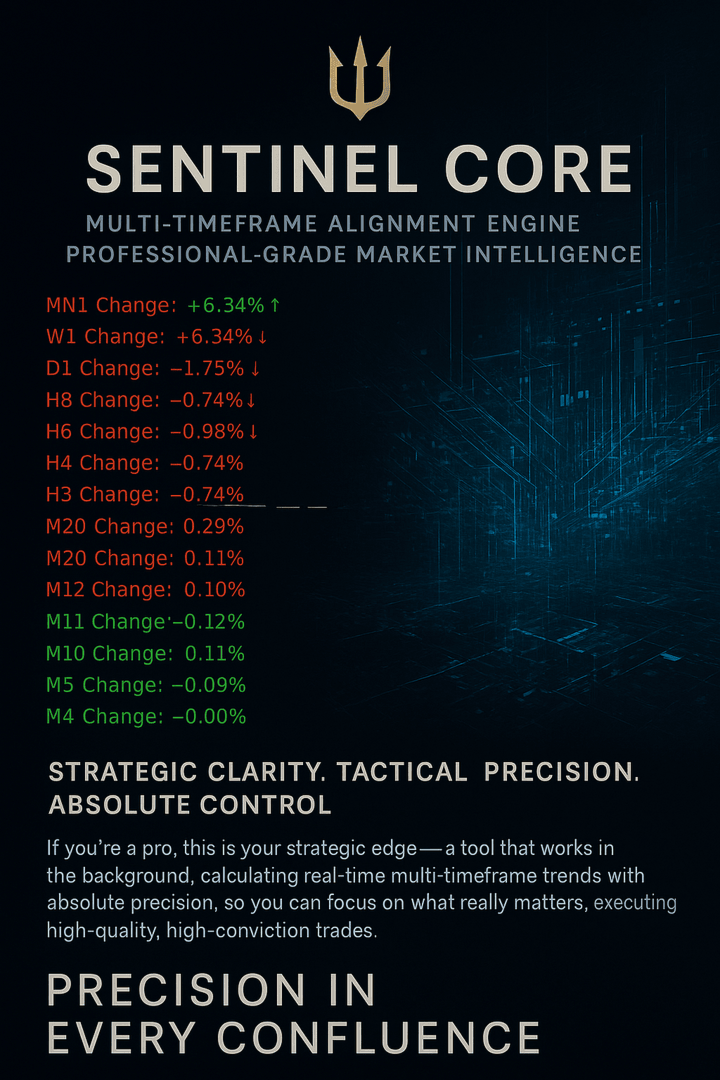 Every permutation is available. Over 177,000+ combinations, all under your command.Sentinal Core is a professional-grade logic engine that scans up to 11 timeframes and filters signals based on configurable percentage change thresholds. Designed for precision confirmation in high-stakes environments. Ideal for funded traders, discretionary strategists, and tactical scalpers.