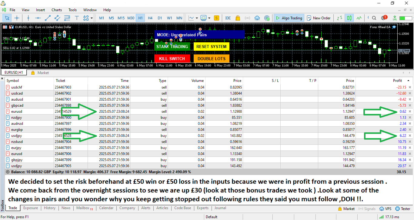 Ruota del Forex è un sistema di trading ibrido manuale/automatizzato progettato per aiutare i trader a sviluppare competenze essenziali attraverso un approccio pratico al mercato. Questo sistema si concentra sul dimensionamento delle posizioni, sulla gestione del rischio e sulla strategia di uscita - i componenti che realmente determinano la redditività a lungo termine.