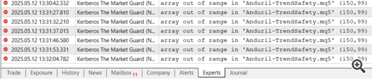 I am seeing more of these errors "array out of range in 'Anduril-TrendSafety.mq5' (150,99)"