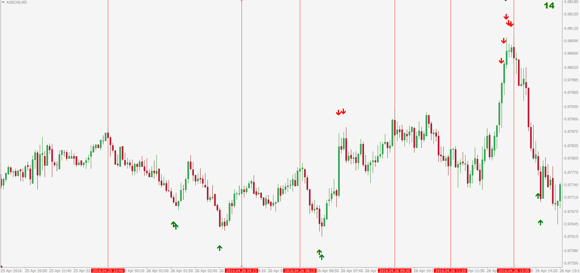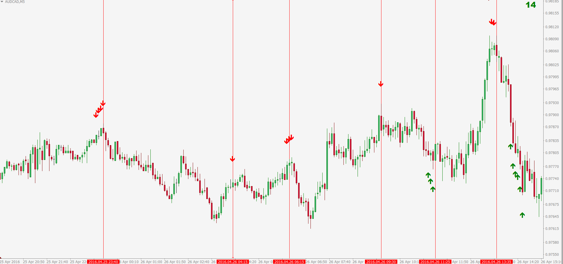 Now, I will take the same chart and I delete arrows and leave only vertical lines from volume-weighted RSI Pointer. I'm adding arrows from "RSI Pointer" with settings - RSI Period 7, level=20. And, as you can see on the last vertical line, we've got confirmation from both indicators, because there is confirmation from volume-weighted RSI (vertical line on chart) and also from RSI (group of red arrows). There was also a lot of "room to the left" (supply and demand). After big movement UP we had big movement DOWN - it was a great opportunity to SELL. As we can see, it was confirmed by first red candle engulfing 2 previous green candles on top:
