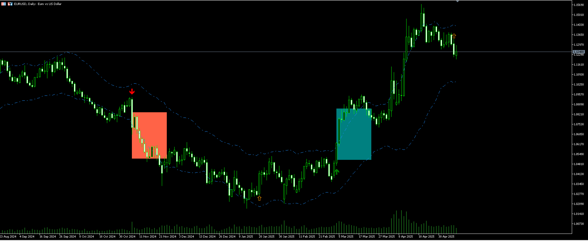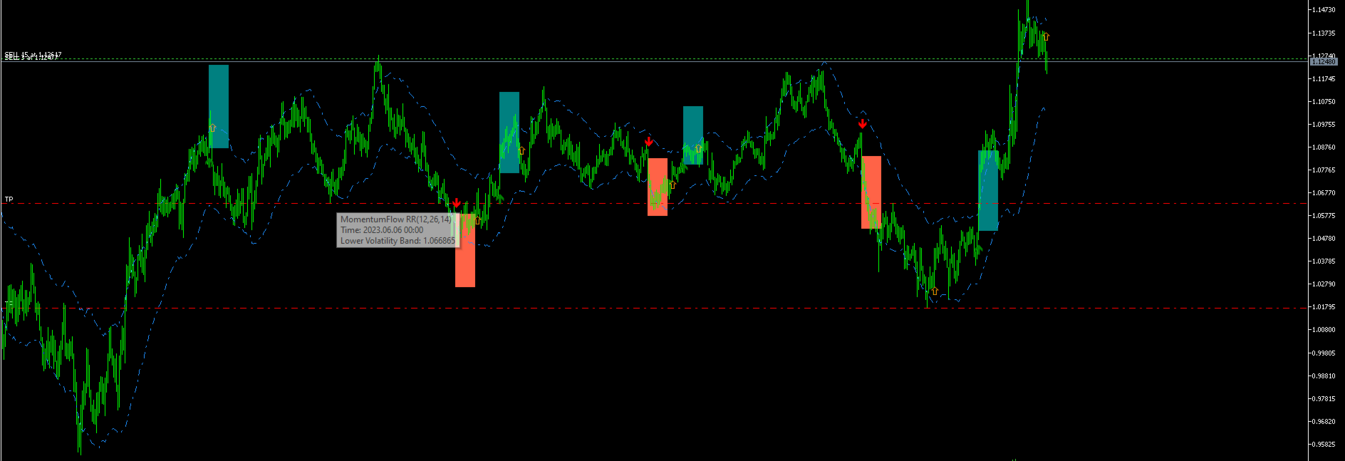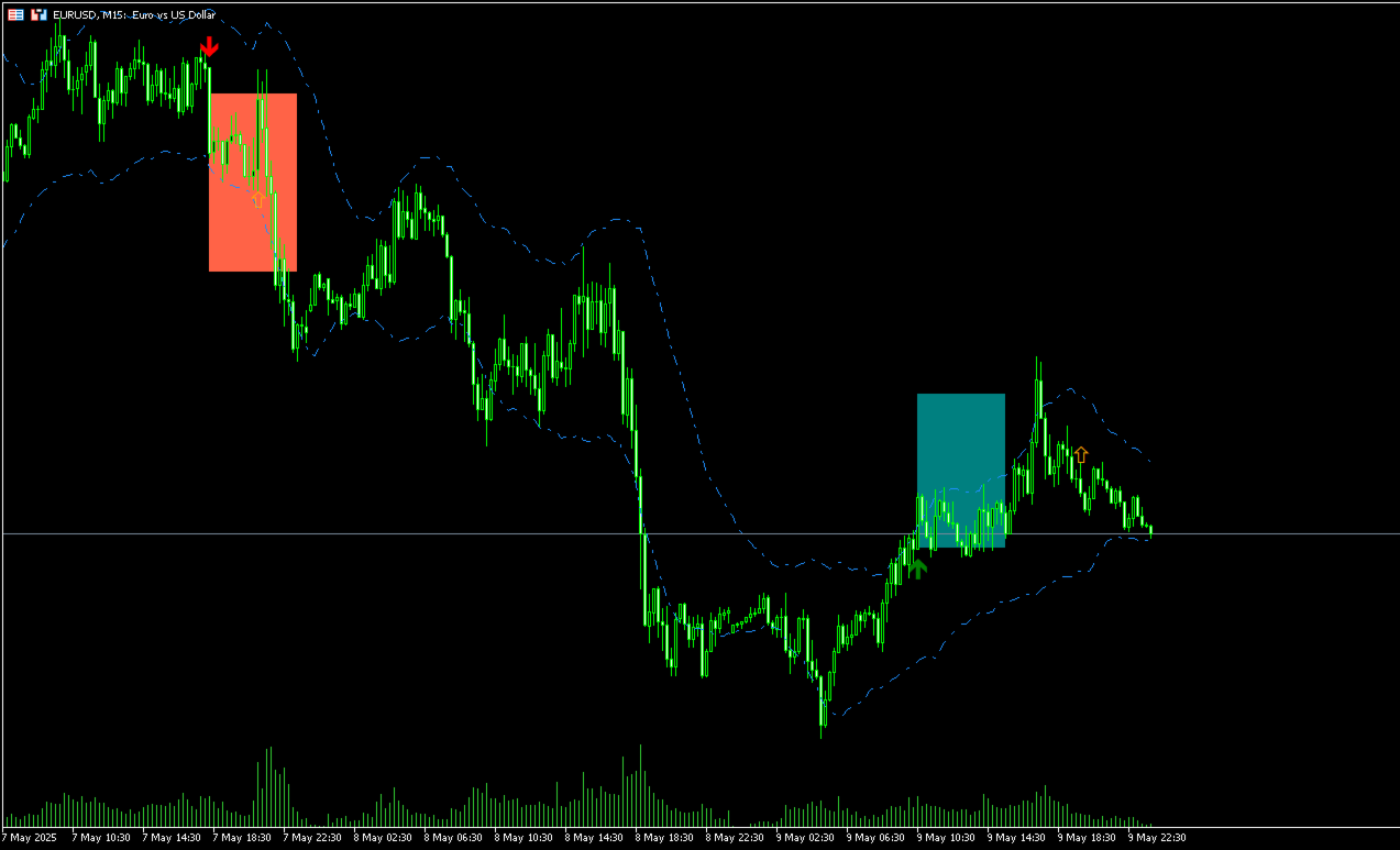 Signal Generation (Entry): When a strong momentum breakout aligns with the confirmed trend direction (e.g., upward breakout in an uptrend), a clear Buy or Sell arrow is plotted on your chart.