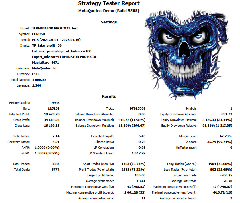 (Results based on MetaTrader 5 Strategy Tester — EURUSD M15, 2015–2026, high quality data)(more than 10 years of real market conditions back-testing) with excellent results: