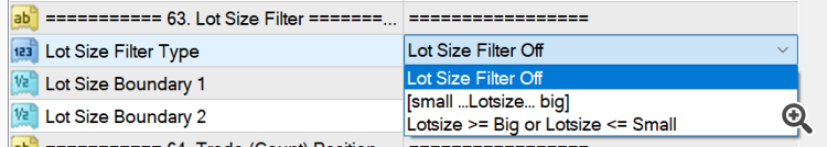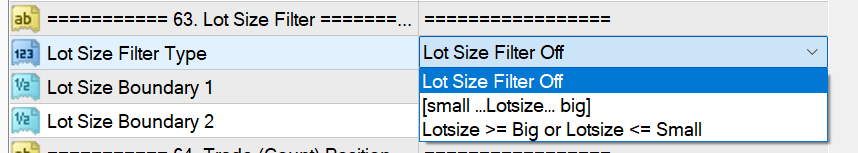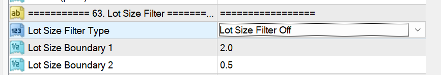 Filters trades after your lot calculation/rounding. You can either allow only a range or allow only outside a range (i.e., block the middle band). Boundaries are unordered: the EA will auto-resolve small and big from LotSizeBoundary1/2 .