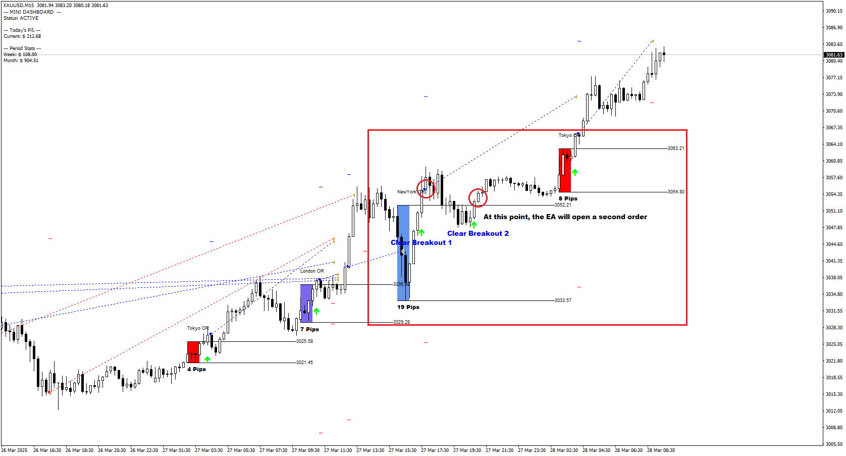 Stick to timeframes like the 15 minute chart or H1 for breakout confirmation. Lower timeframes like M1 or M5 can give false signals. For take profit, set manual but realistic targets for each pair, smaller goals get hit more frequently.