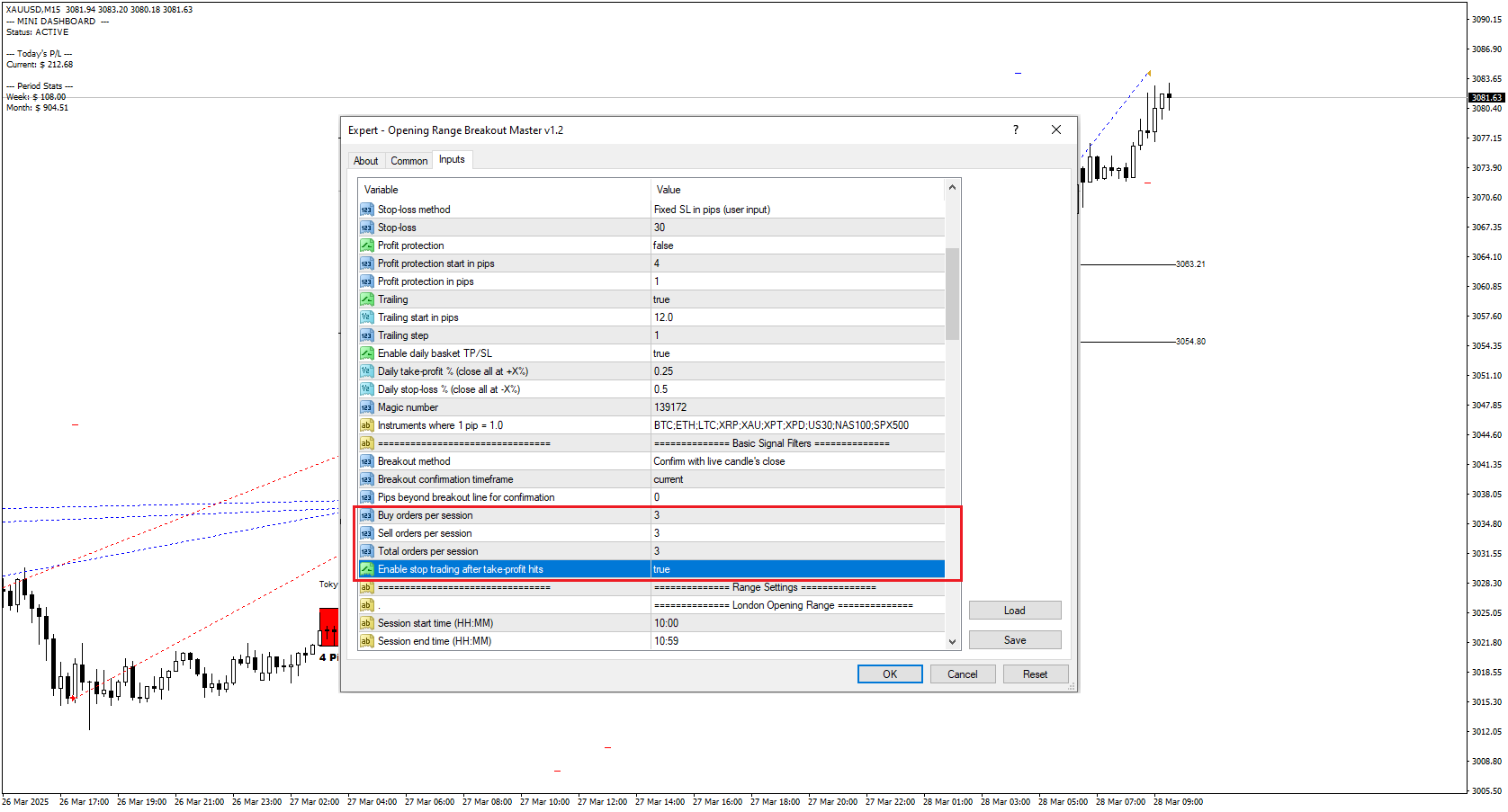 Answer: You can control how many trades the EA attempts per session using the "Buy orders per session" and "Sell orders per session" inputs, plus the "Total orders per session" setting. In the upcoming v1.2 update, I’ve also added a new option called "Enable stop trading after take-profit hits" to give even more control over these limits.