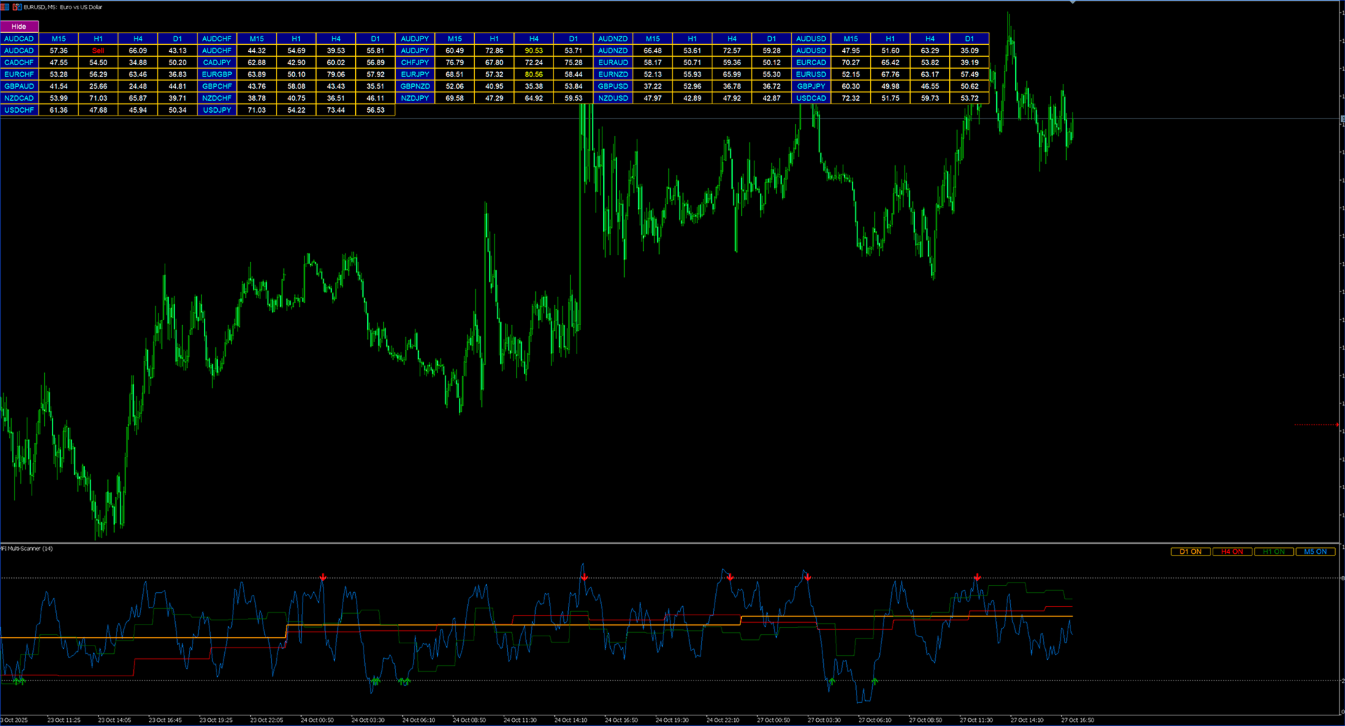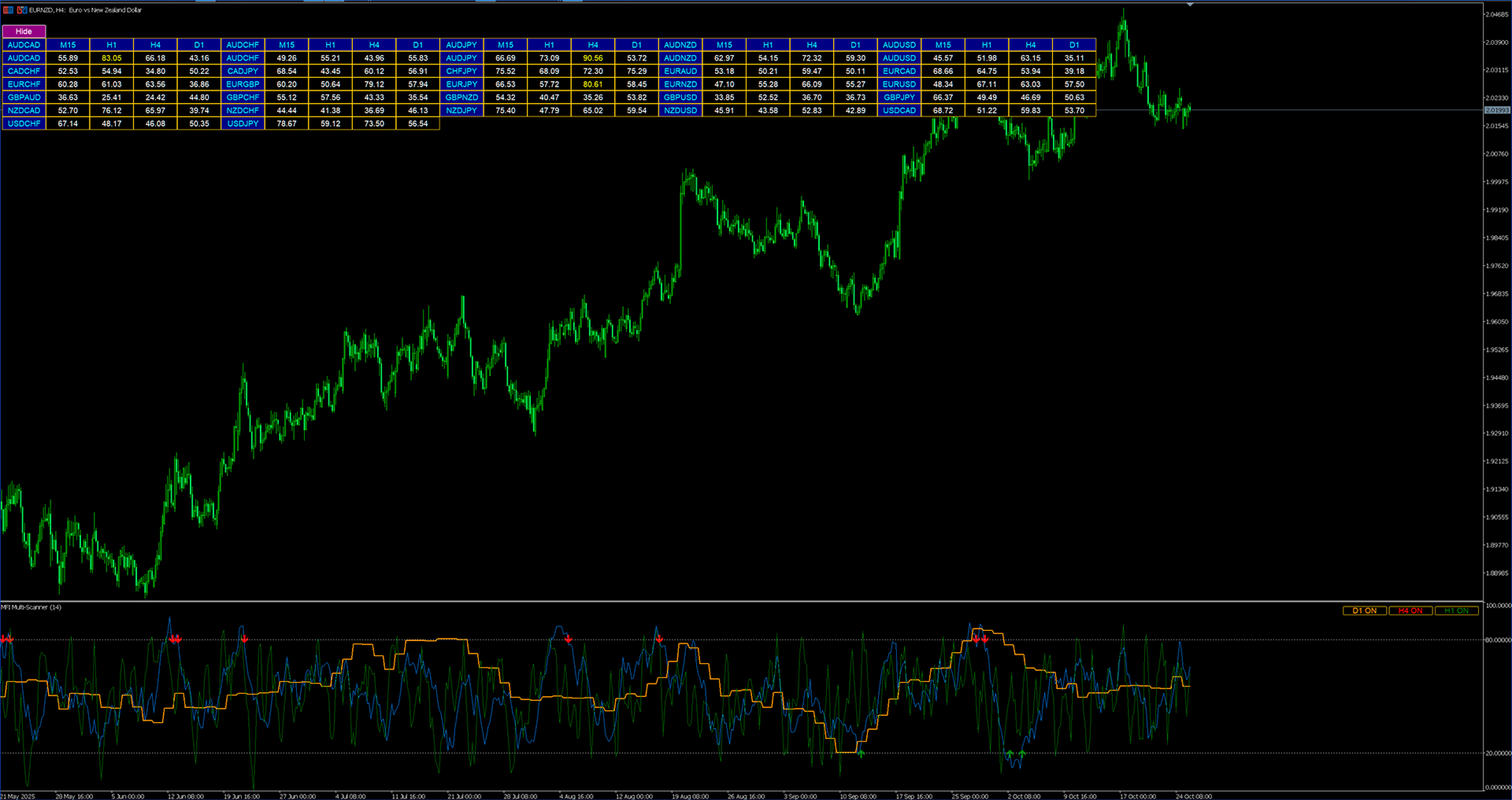 The MFI Multi-Scanner Indicator is designed for automatic scanning of multiple currency pairs and timeframes to detect overbought and oversold signals using the Money Flow Index (MFI). It displays MFI values, signal arrows, and an interactive on-chart table.