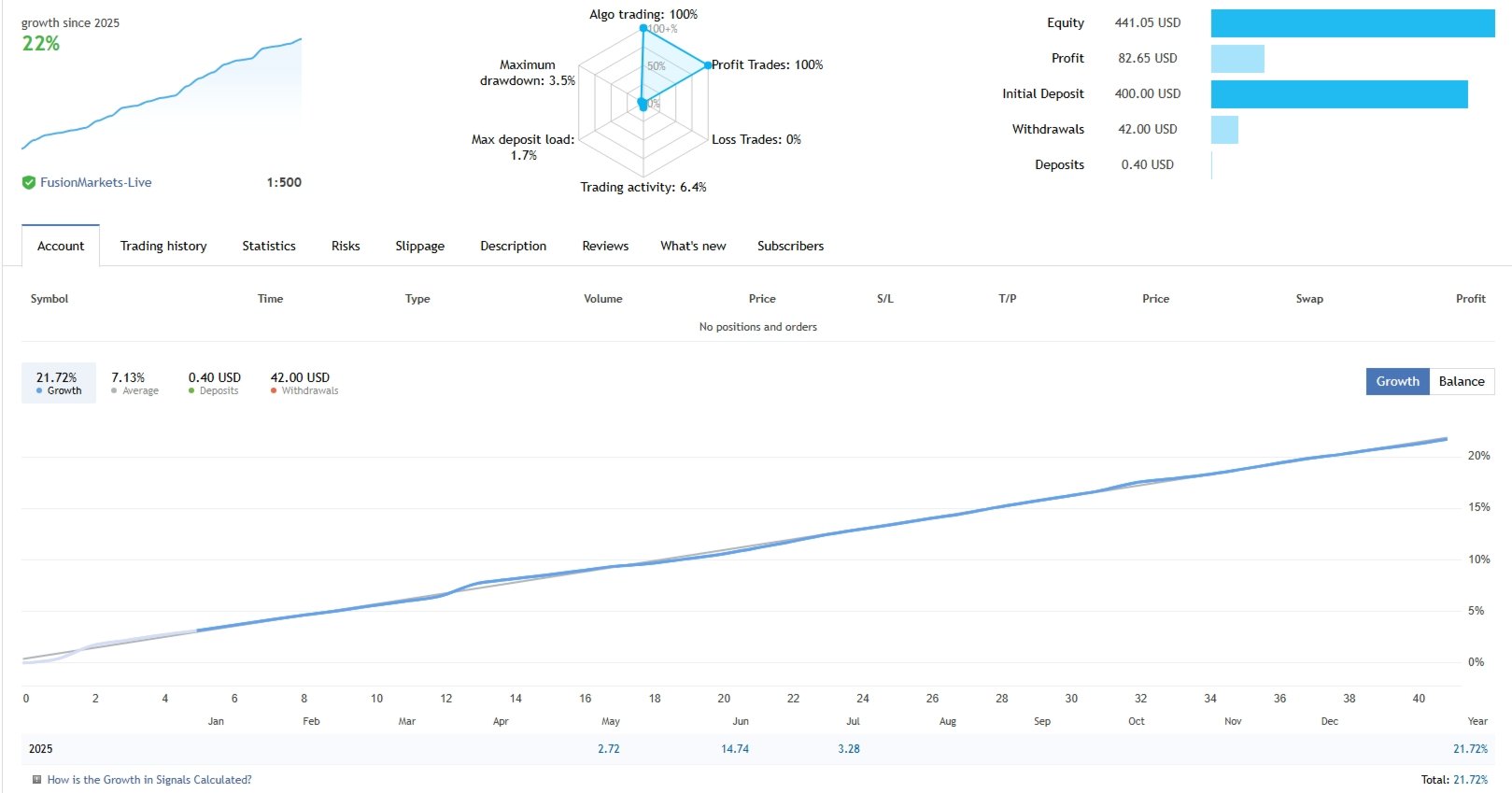 Gold Surge is a simple Expert Advisor trading on the XAUUSD instrument. There is no "artificial intelligence" in it, there is no rigged story, there is no guaranteed result that you will become a millionaire and the like. There is only a result here and now.