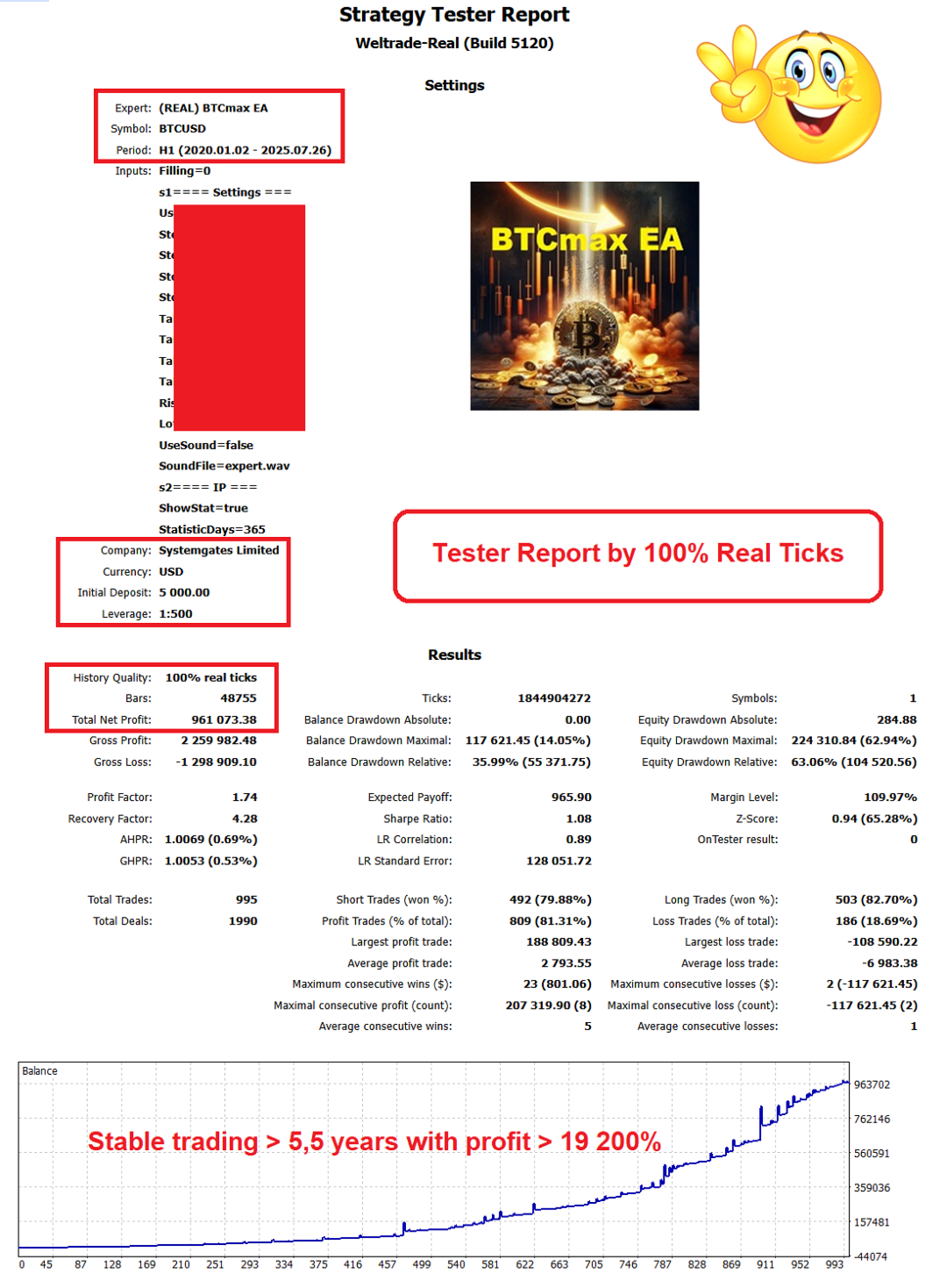 | MY ADDITIONAL PAID SERVICES: - Expert Advisor optimization for period up to 2 years is 99 USDT TRC20 per one Symbol & one Real Account in the your Broker. - Expert Advisor optimization for period up to 5 years is 199 USDT TRC20 per one Symbol & one Real Account in the your Broker. - Expert Advisor optimization for period up to 10 years is 299 USDT TRC20 per one Symbol & one Real Account in the your Broker. NOTE: Expert Advisor optimization is possible only if the History Quality of 100% real ticks for the optimization period selected above is available and after advance payment for optimization. |