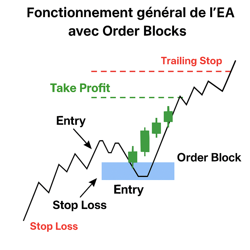 The algorithm scans historical price data on a defined timeframe to identify relevant Order Blocks, then automatically places orders (limit or market) when a bullish or bearish reversal opportunity is detected. It is particularly well-suited for swing trading strategies.