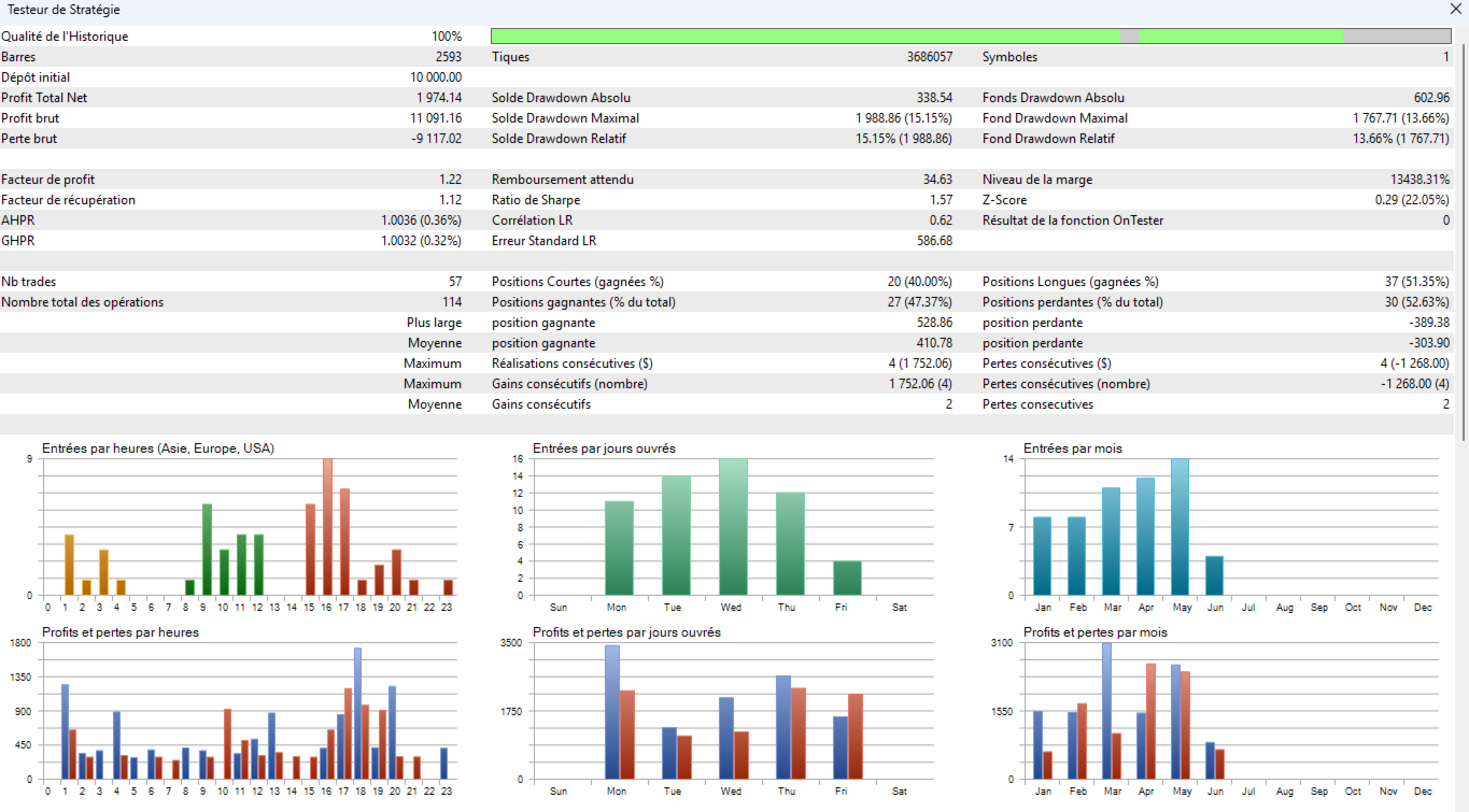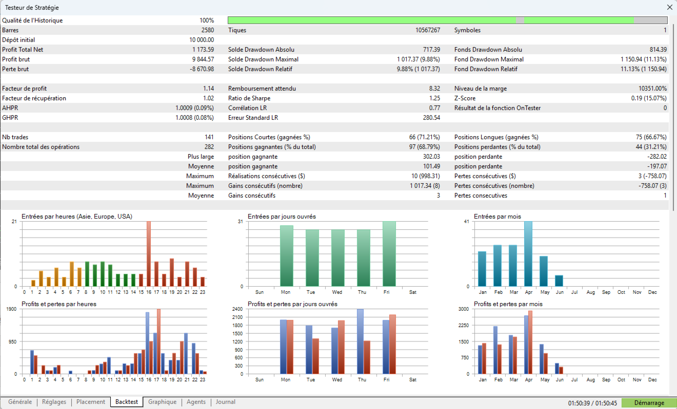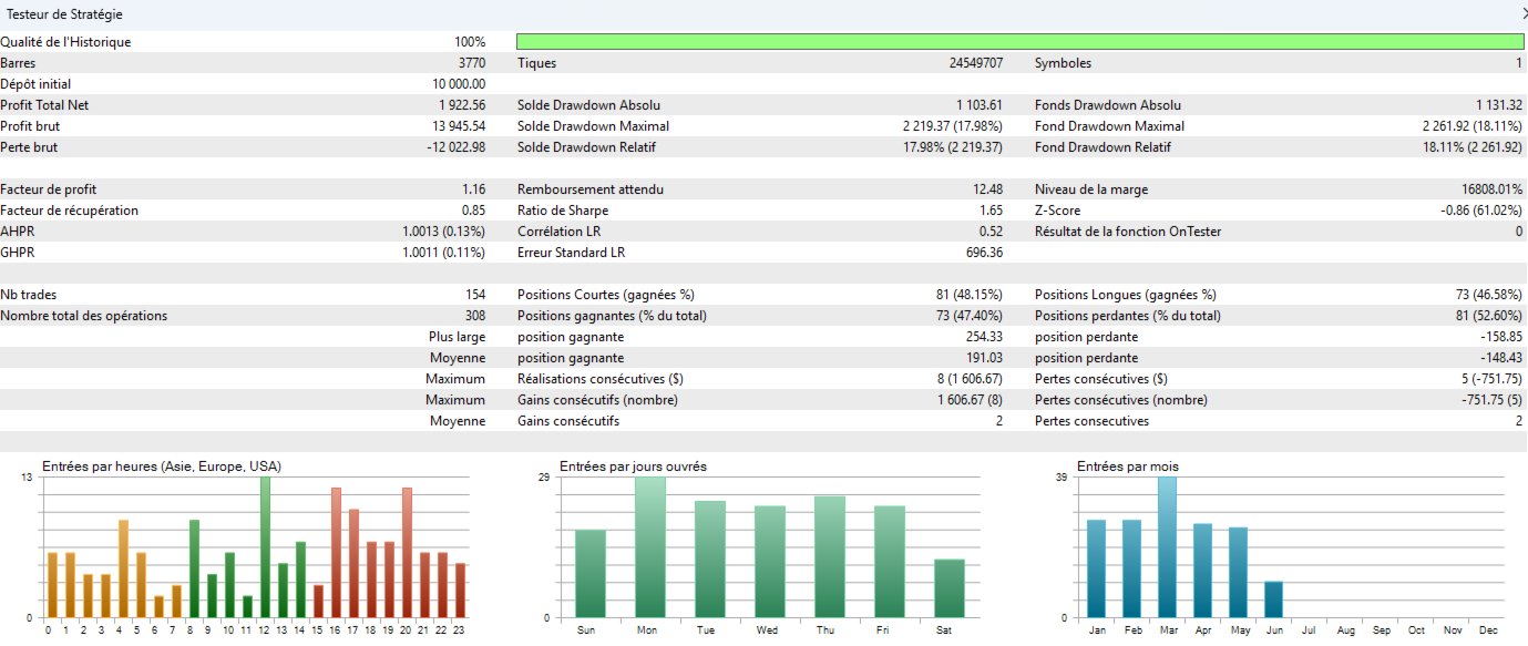 The EA can be used on Forex, indices, commodities, and cryptocurrencies, as long as parameters are adjusted according to the market’s volatility and structure.