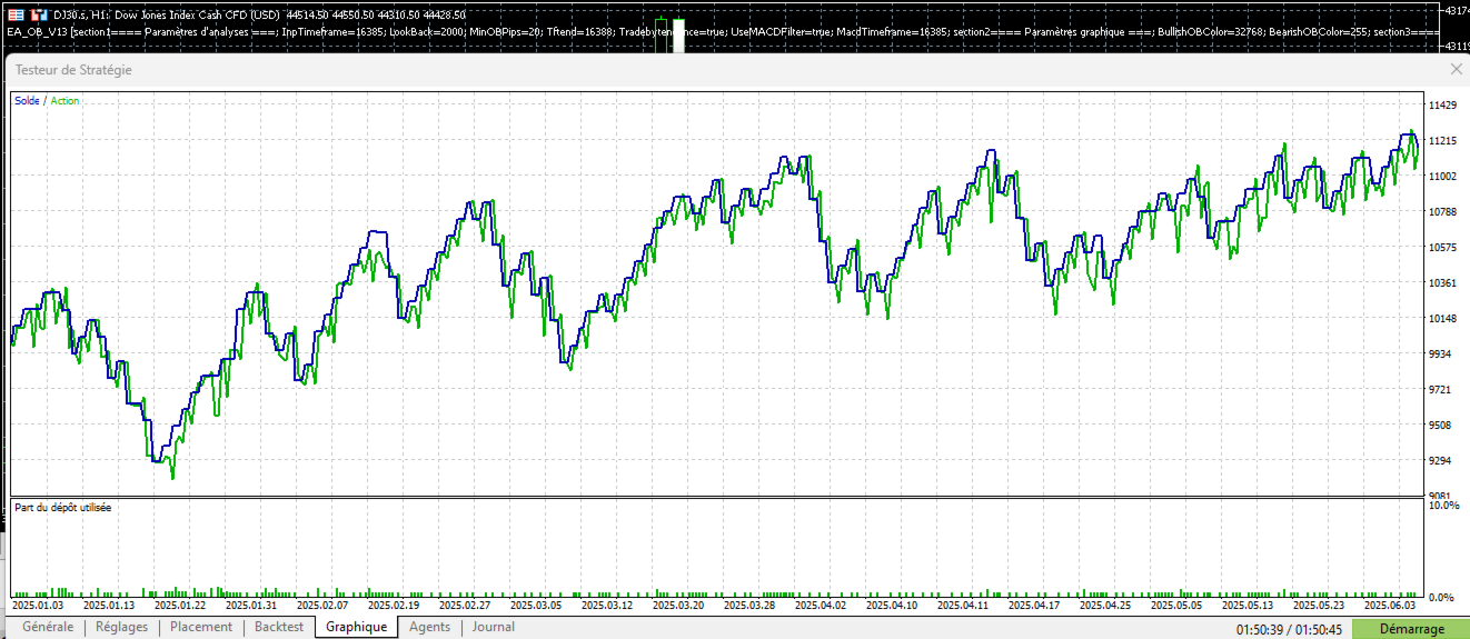 The EA_OB_v10.0 is an Expert Advisor for MetaTrader 5. It uses order block analysis to enter positions on trend reversals, suitable for swing trading strategies. The parameters are divided into sections for clear configuration.