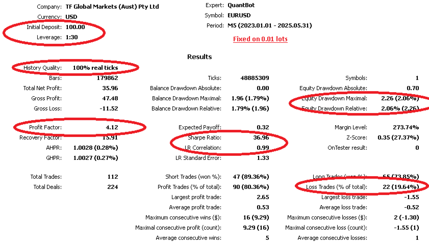 The backtest results based on 100% real ticks demonstrate a relatively high win rate, a high profits-to-losses ratio, small control drawdown, and short holding time.