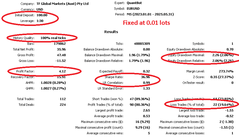 By utilizing appropriate trading asset settings (for instance, EURUSD), this Expert Advisor offers a minimal risk-to-reward ratio of even a $100 micro-account, with a leverage trading of 1:30.