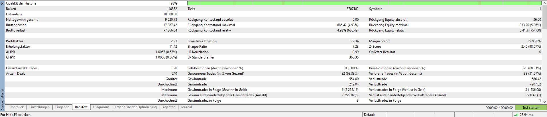 Raccomandazione: Strumenti consigliati: indici azionari come US500 (S&P 500) e NASDAQ100. Timeframe consigliati: 15 min, 30 min, 1 h. Questa strategia di breakout è più efficace in mercati con tendenza chiara e alta volatilità. L’EA non garantisce profitti : testatelo sempre in demo prima di usarlo in un conto reale.