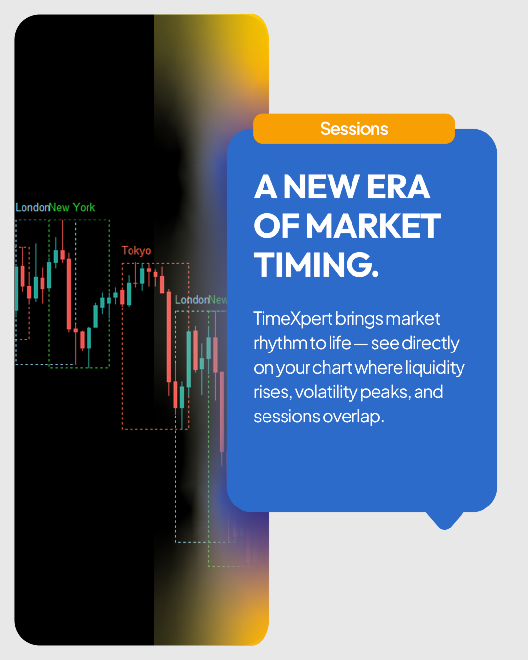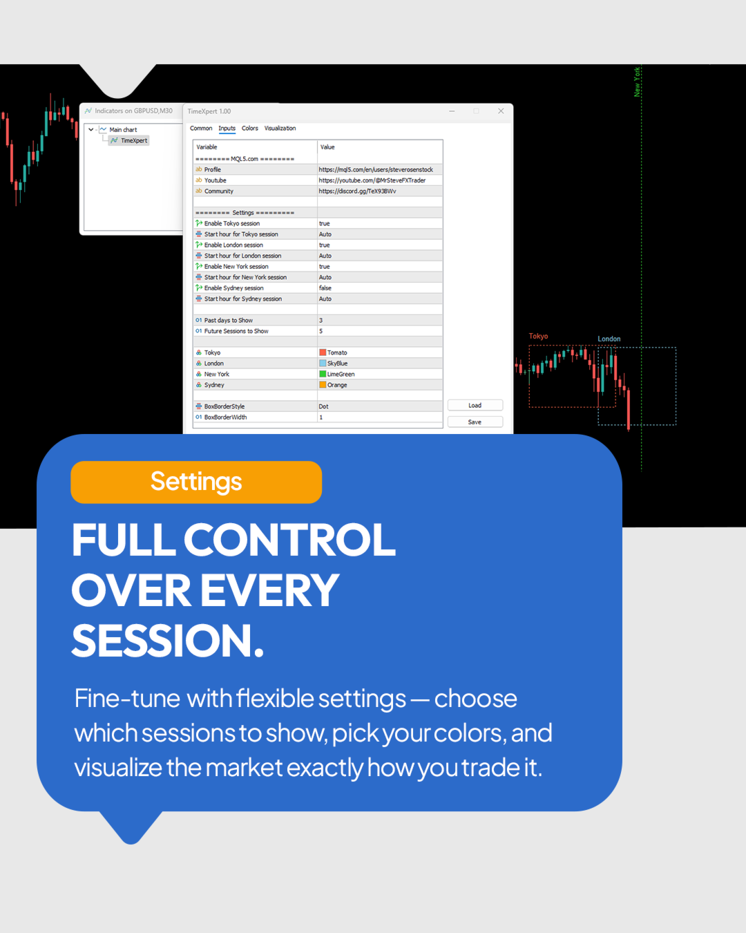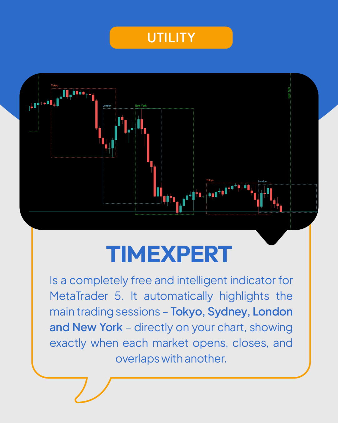 TimeXpert è uno strumento completamente gratuito per MetaTrader 5 che mostra le sessioni di trading globali - Tokyo, Sydney, London e New York - direttamente sul tuo grafico. Invece di calcolare gli orari manualmente, ottieni una panoramica automatica codificata a colori, che ti mostra a colpo d’occhio quando i mercati aprono, si sovrappongono o chiudono. Questo ti permette di identificare istantaneamente dove appare la volatilità, quando aumenta la liquidità, e quali periodi si adattano meglio alla tua strategia di trading. Tutti gli elementi sono completamente personalizzabili - dai colori agli stili delle linee, fino al numero di sessioni mostrate, rendendo TimeXpert un compagno flessibile per ogni trader. TimeXpert ti aiuta a perfezionare il timing dei tuoi trade mostrando esattamente quando inizia il movimento e quali sessioni generano gli impulsi di mercato più forti - uno strumento essenziale per qualsiasi setup professionale. Con il suo design pulito e minimalista, TimeXpert trasforma il tuo MetaTrader 5 in una mappa visiva globale dei mercati - precisa, intuitiva e completamente gratuita.