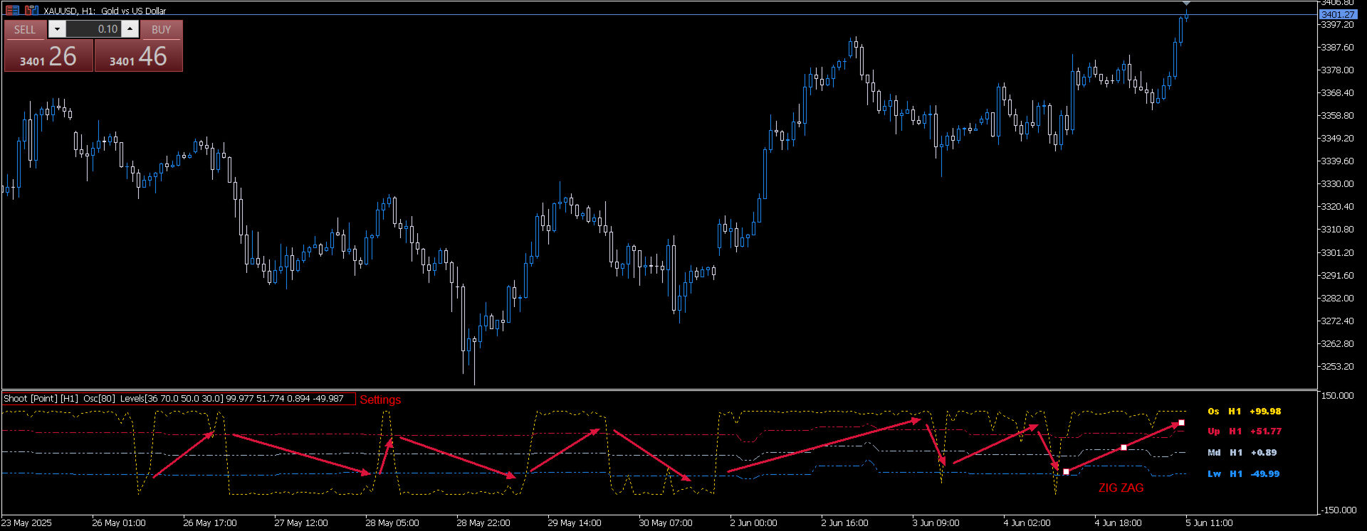 The indicator can be used as a zig zag in medium and larger time frames. In this case, it is an optimal substitute for Weis Wave, consequently for Wave Chart of Wyckoff’s theory.