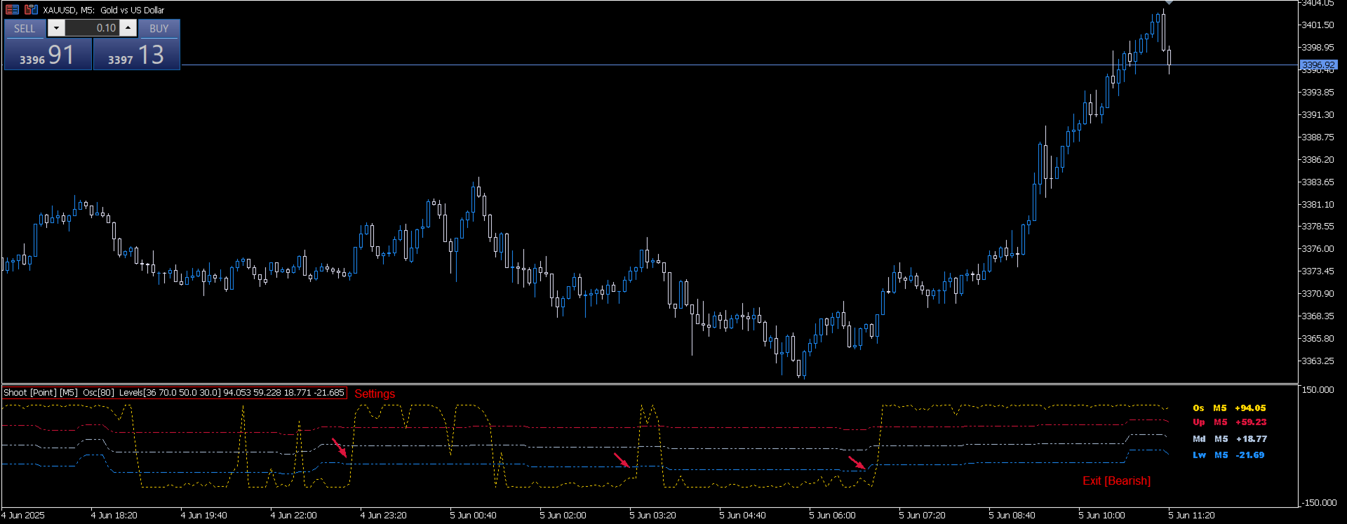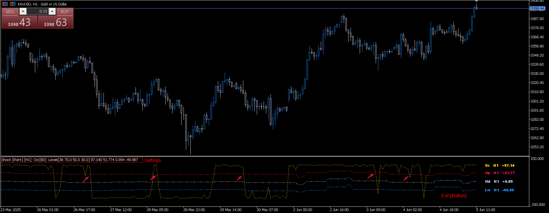 bullish exit signal: oscillator crosses or upper level, or middler level, or lower level from top to bottom.