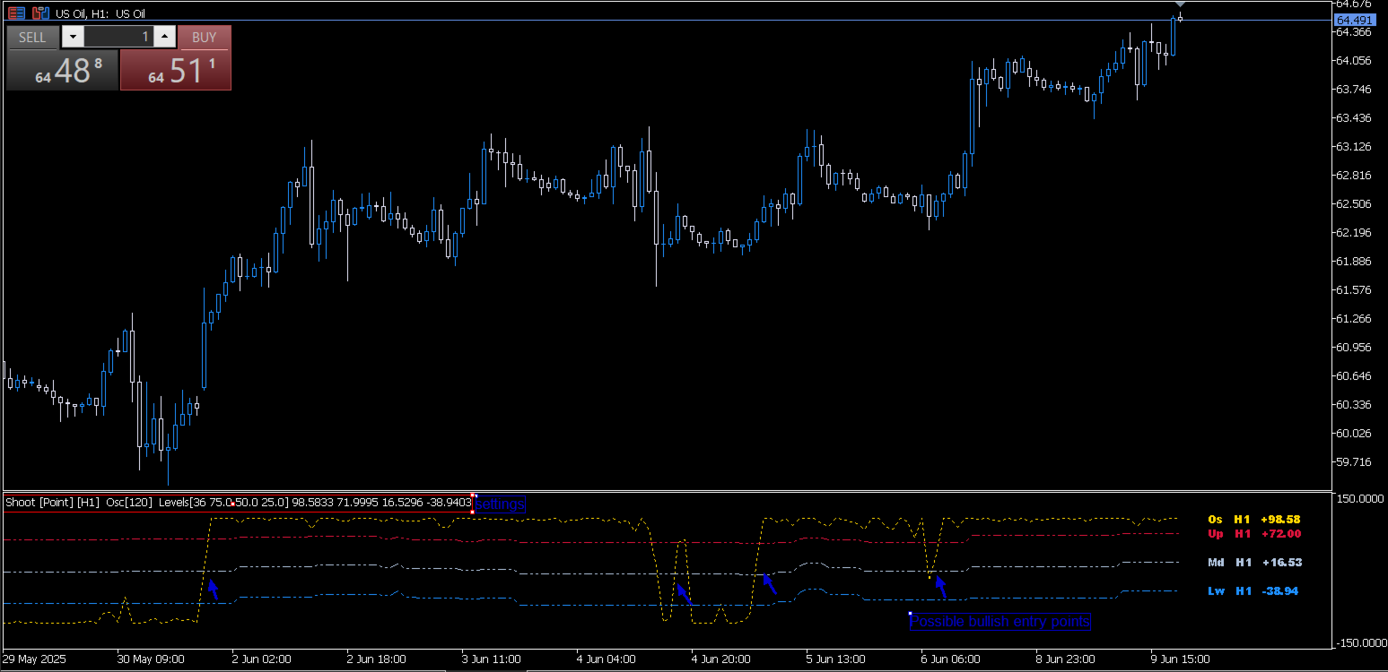 bullish entry signal: oscillator crosses or upper level, or middler level, or lower level from bottom to top.