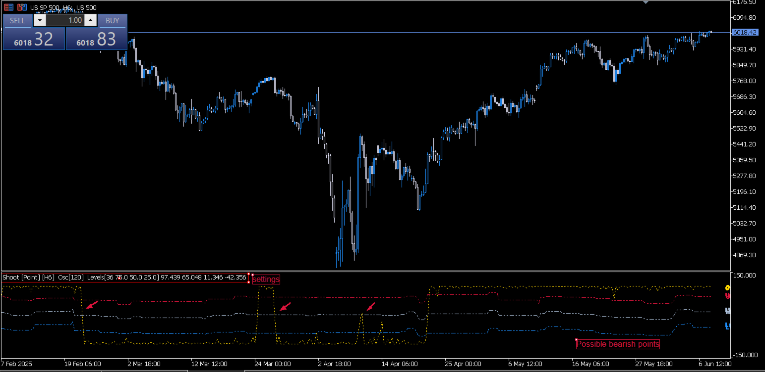 Shoot [Point] is momentum indicator composed of one oscillator and three floating levels [upper, middler, lower]. The oscillator crosses the floating levels forming Shoot Points! The inputs can be used to adjust the oscillator, the floating levels and the alert signals. It is designed only for the MT5 platform.