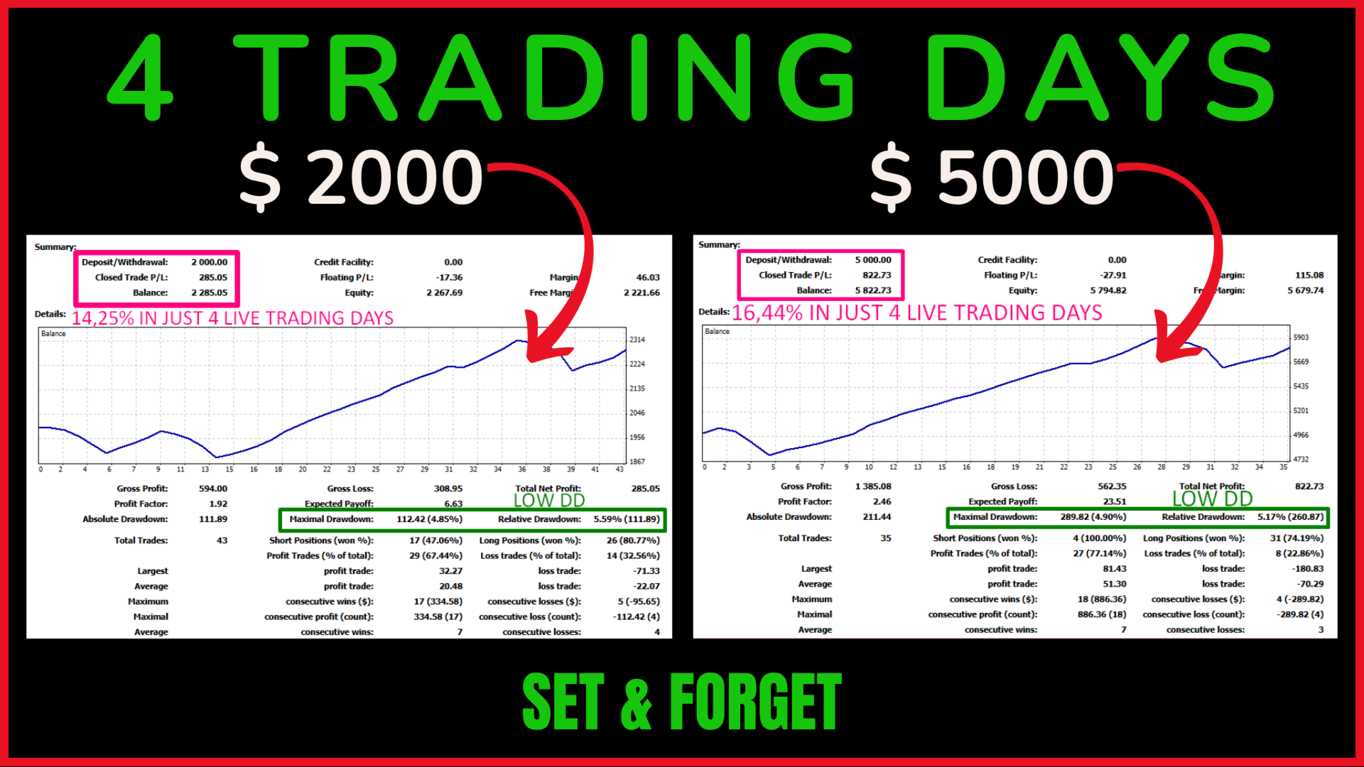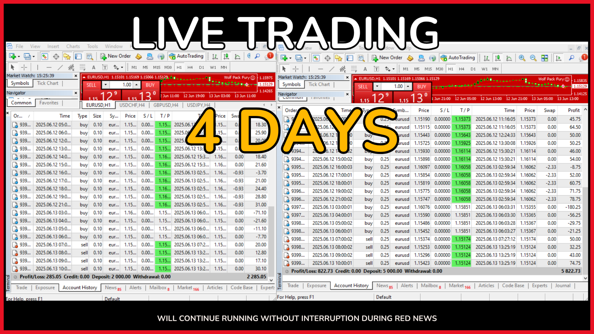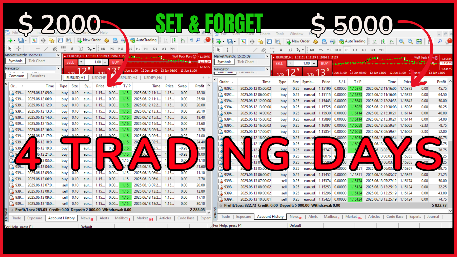Wolf Pack Fury EA è progettato per trader che danno priorità alla coerenza e alla gestione prudente del capitale. Non promette miracoli da un giorno all’altro; il suo obiettivo è fornire rendimenti mensili stabili mantenendo il controllo totale del saldo del conto. L’EA opera 24 ore su 24, cinque giorni alla settimana, utilizzando algoritmi basati sulla volatilità per adattarsi a diverse condizioni di mercato.