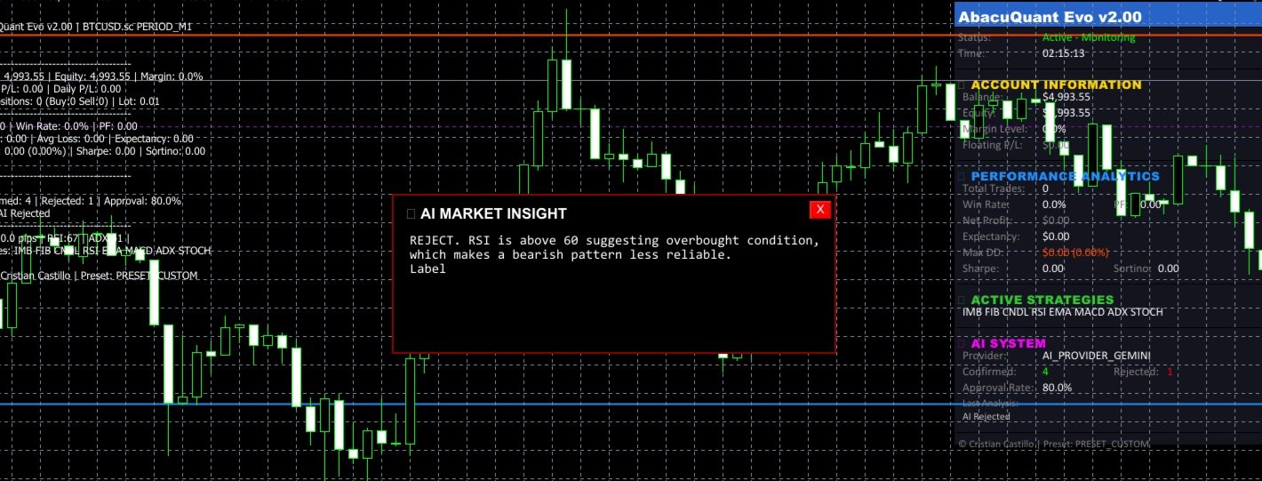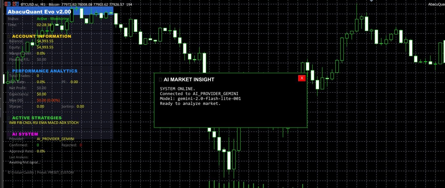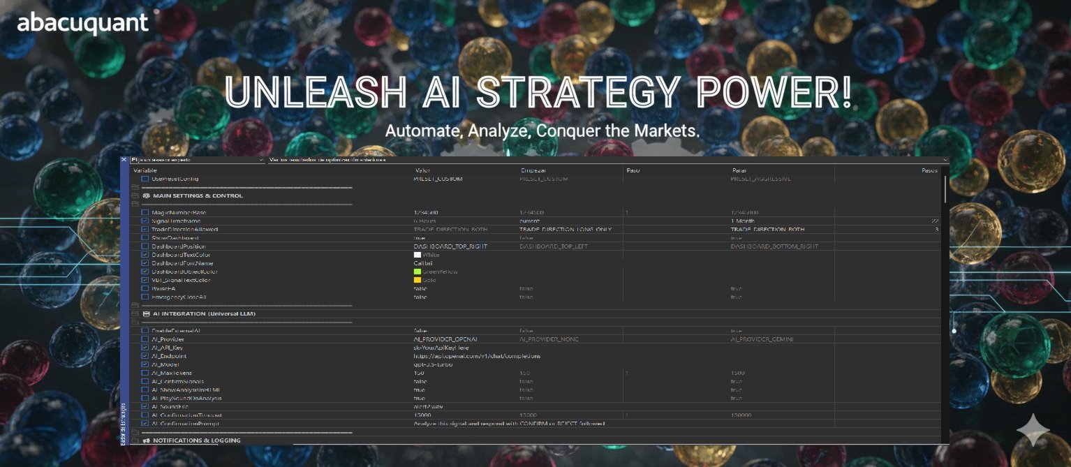 AbacuQuant is not another indicator-based robot. It is a multi-strategy institutional-grade trading system powered by real Artificial Intelligence (OpenAI, Gemini, DeepSeek) for signal confirmation and market analysis.