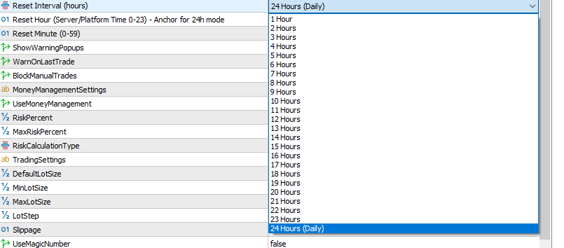 1- The EA is designed to be a daily limiter, which is 24 hours cycle.