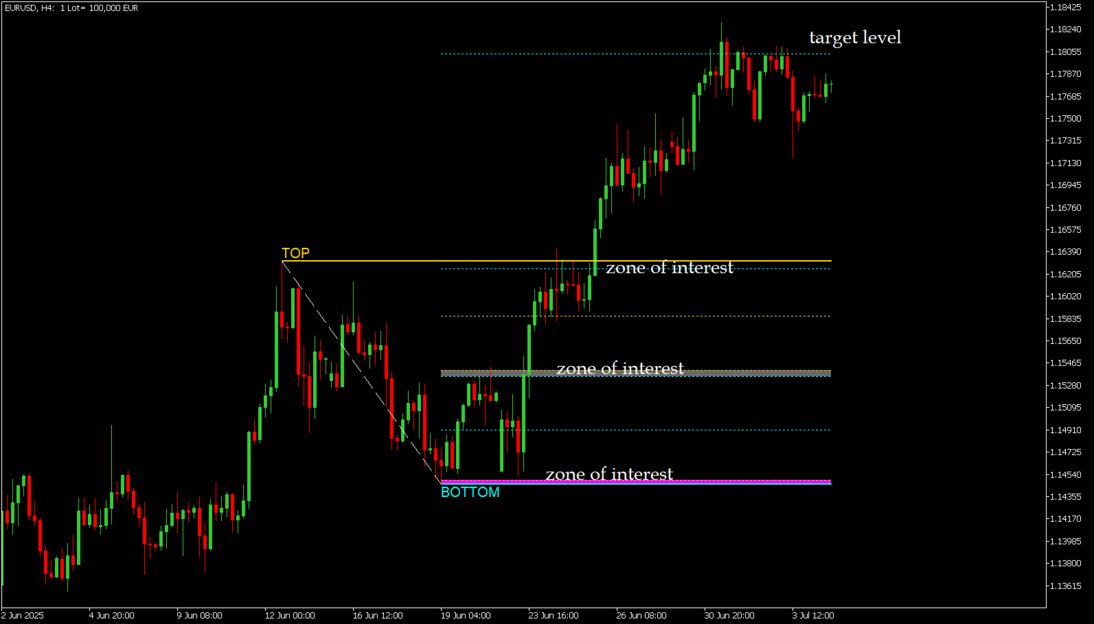 Linee color acquamarina che indicano i target di prezzo dei tori.