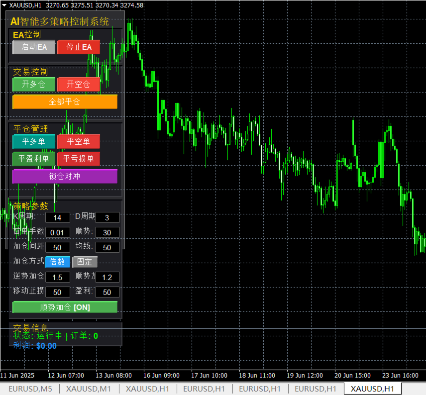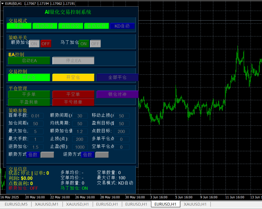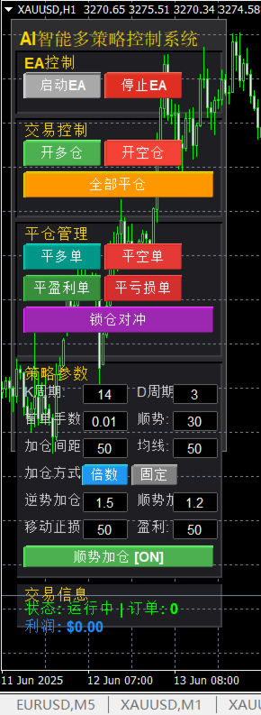 Hello everyone, I would like to introduce an AI intelligent trading control strategy that combines Martin's position adding and opportunistic position adding strategies. The parameters can be changed at any time on the trading interface according to market changes, and a single strategy can also be activated. When the market is shaking, Martin's strategy can be activated, and opportunistic strategies can be activated when there is a possibility of a one-sided market. This greatly helps traders to manage risks and improve execution speed. Each parameter of EA can be modified on the trading interface without the need for backend modifications. Here are the parameter descriptions: Key area: Start EA, close EA; open long position, open short position, close all positions, close long order, close short order, close profit order, close loss order, lock position hedging, choose multiple or fixed position adding method, and add position switch accordingly; The icon can be loaded at any minute, and it is recommended to load the chart within 5 minutes; By default, the KD indicator will have a bullish golden cross and a bearish dead cross. Then, execute the strategy of adding positions along the trend and the Martin strategy. Alternatively, you can disable the strategy of adding positions along the trend and only activate the Martin strategy; Parameter setting area: 1. KD index cycle parameter, K parameter: 5; D parameter 3; 2. First hand count: 0.01; 3. Increase spacing: 500 points (counter trend increase spacing); 4. Going with the flow: 300 points (adding warehouse spacing along the flow); 5. moving average: 10 (moving average cycle, with long positions above the moving average and short positions below the moving average); 6. Counter trend increase ratio: 1.5 (increase ratio); 7. Take advantage of the situation and increase the warehouse ratio: 1.2 (warehouse ratio); 8. Placement method: Placement based on multiples or fixed positions; 9. Mobile stop loss: 500 points, triggered when the order is profitable; 10. Profit: 50. When the total profit of all orders reaches $50, close all orders; 11. Take advantage of the trend to add positions: ON, OFF, activate and deactivate the strategy of taking advantage of the trend to add positions; Transaction information display status: running/closed; Profit; Kind reminder: Martin strategy should do a good job in position management, reasonable adjustment of warehouse spacing, and risk control. It is the unique function of this EA to activate the strategy of adding positions at the right time, which can be flexibly used to adjust the strategy.